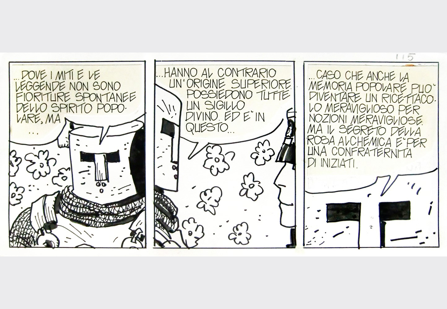 Striscia originale n. 115 realizzata da Pratt per "Le Elvetiche: Rosa Alchemica", ventottesima avventura di Corto Maltese pubblicata per la prima volta sulla rivista Corto Maltese dalla Milano Libri Edizioni nel 1987. Penultima avventura di Corto, ambientata in una Svizzera attraversata da misteri antichi: la ricerca del Sacro Graal vista da Hugo Pratt.