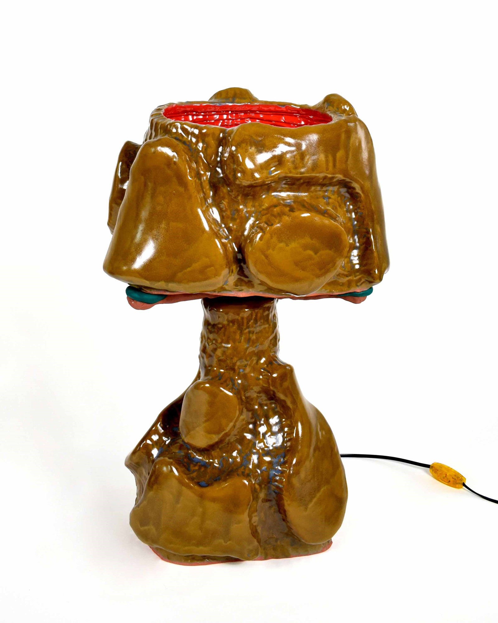 Gerstley Sean, This monumental ceramic lamp stands two- feet (61 centimeters) tall. The shade and base are covered with chunky blocks sep- arated by integrated dimpled trought. The interior is glazed in a contrasting red hue. -- Unique Shipped from USA Item liable to VAT Largh. 36,8 - Prof. 30,5 - Alt. 61 Cm 2021