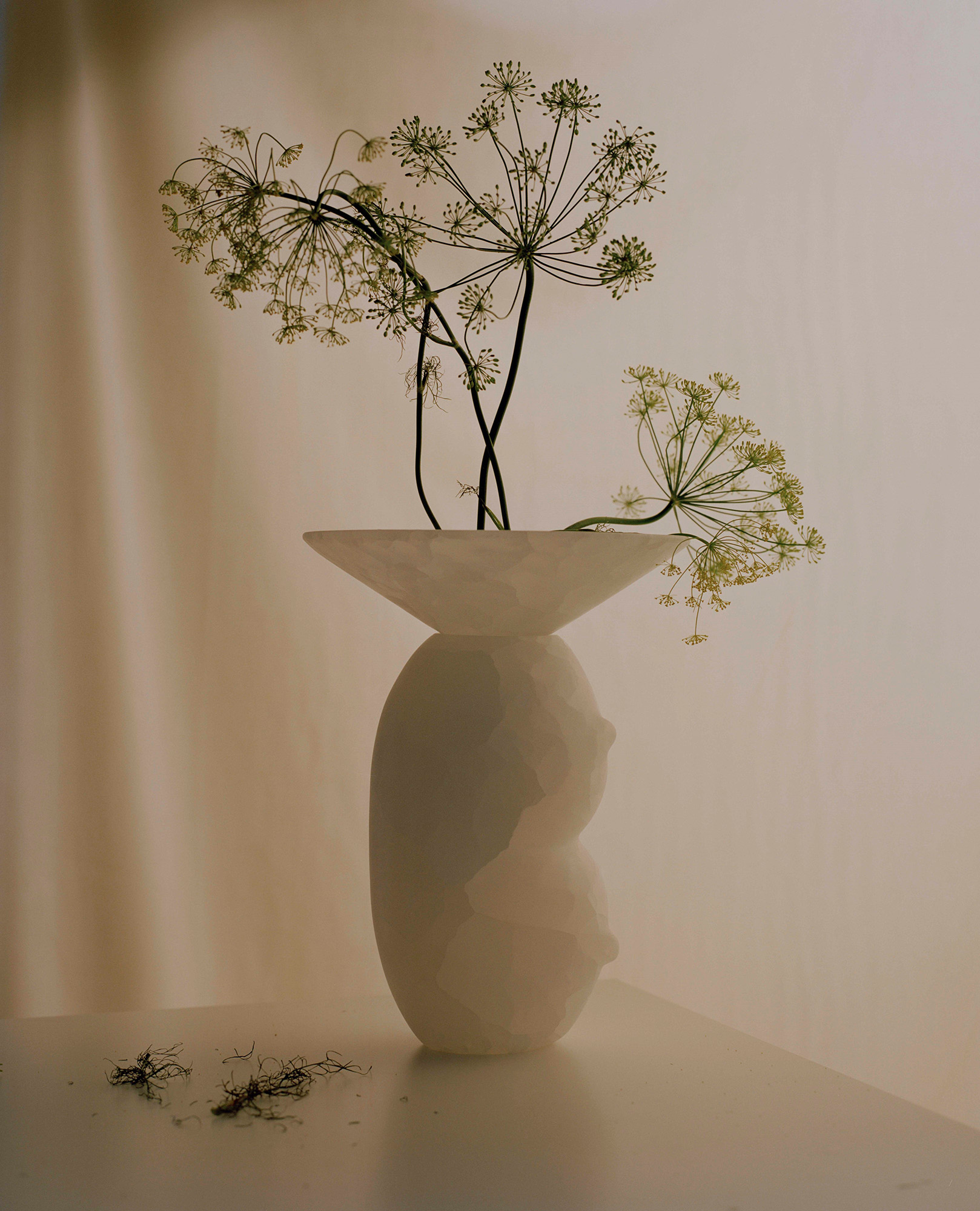 Cameranesi Valentina, Product Description: How soft the stone can be? The idea was to create a vase with a strong aesthetic impact, researching the use of marble in the ancient Roman churches as well as the virtuosity of the tex- tiles and in the anatomical shapes of the classical sculptures. Far from the usual contemporary approach of perfection and geometrical cleaning, the “Avalon” vases present curve and complex shapes, with a for- mal ambiguity that need the ability of a sculptor to get as a result vases where the veining and chromatic variations, typical of the stones applied, moves and spreads out. The name of the vase is Clelia and this is a special version in total white onyx. -- Unique Shipped from Italy Item liable to VAT Largh. 24 - Alt. 31 Cm 2020
