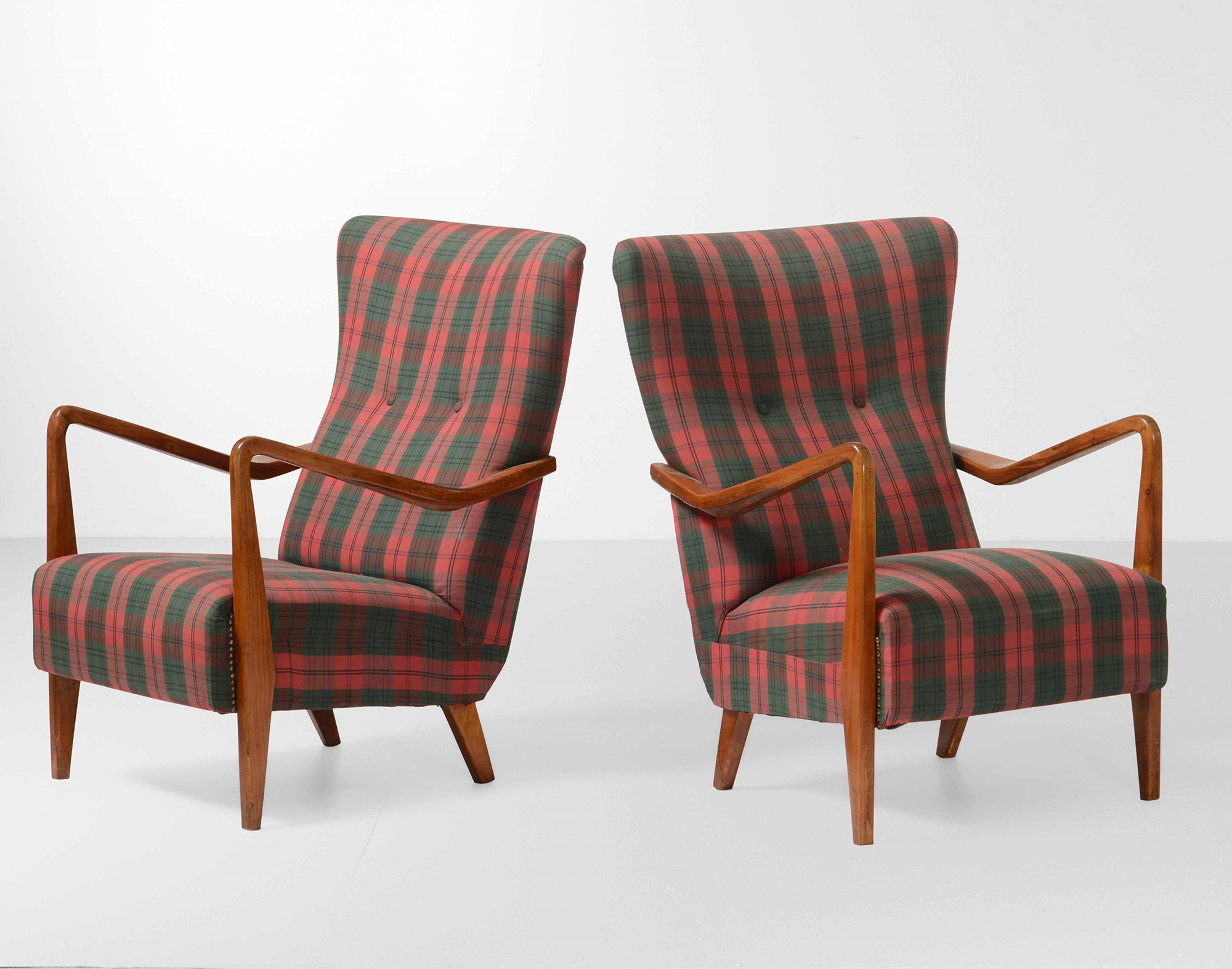 Lotto 34 | Coppia di poltrone con struttura in legno e rivestimenti in tessuto.,