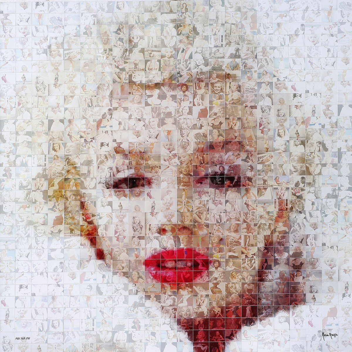 MURGIA MARIA (n. 1935) Omaggio a Marilyn Monroe. 2012. Fotomosaico digitale. Cm 60,00 x 60,00 x 3,00. Firma in basso. Al retro certificato di garanzia a cura della Galleria Punto Arte, La Spezia. Opera archiviata presso l'Archivio Opere digitali Maria Murgia, come da documentazione allegata riportante il relativo numero di repertorio.