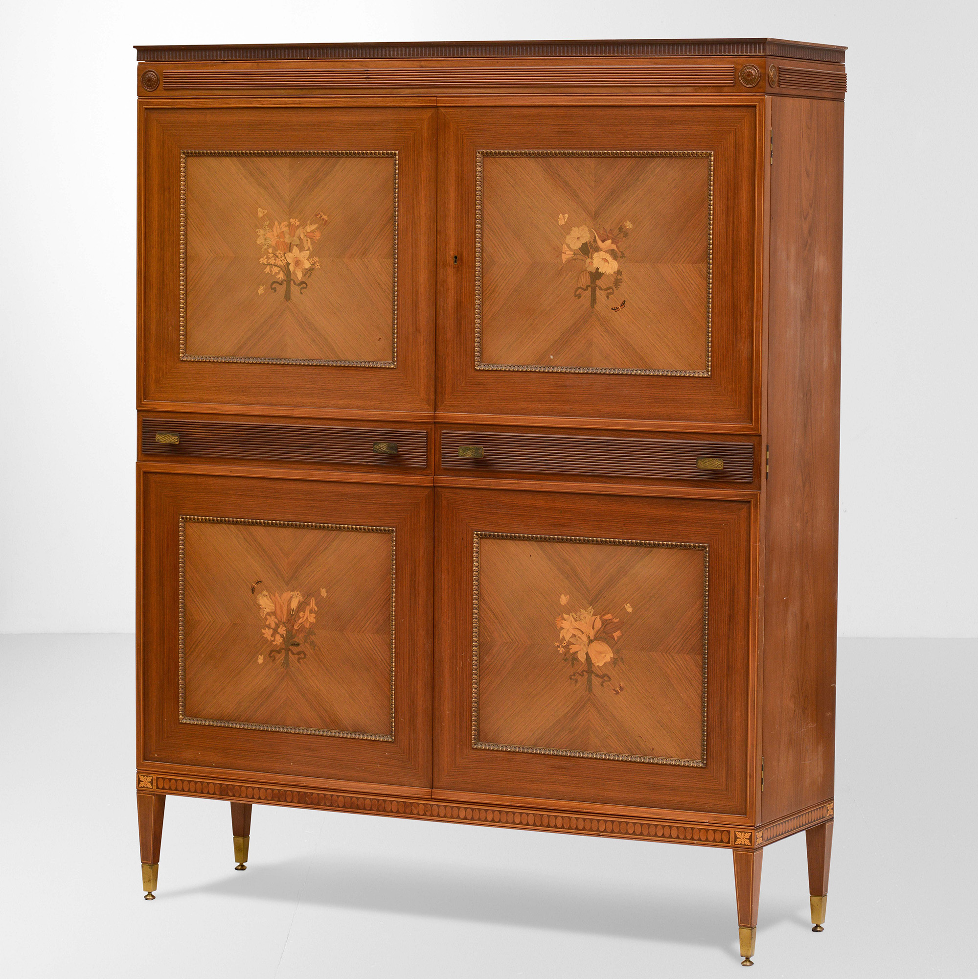 Paolo Maggi, Mobile bar contenitore con struttura e sostegni in legno, ante in legno intarsiato e puntali in ottone. Certificato di autenticità. Prod. Marelli e Colico, Italia. 1950 ca. cm 150x49x192