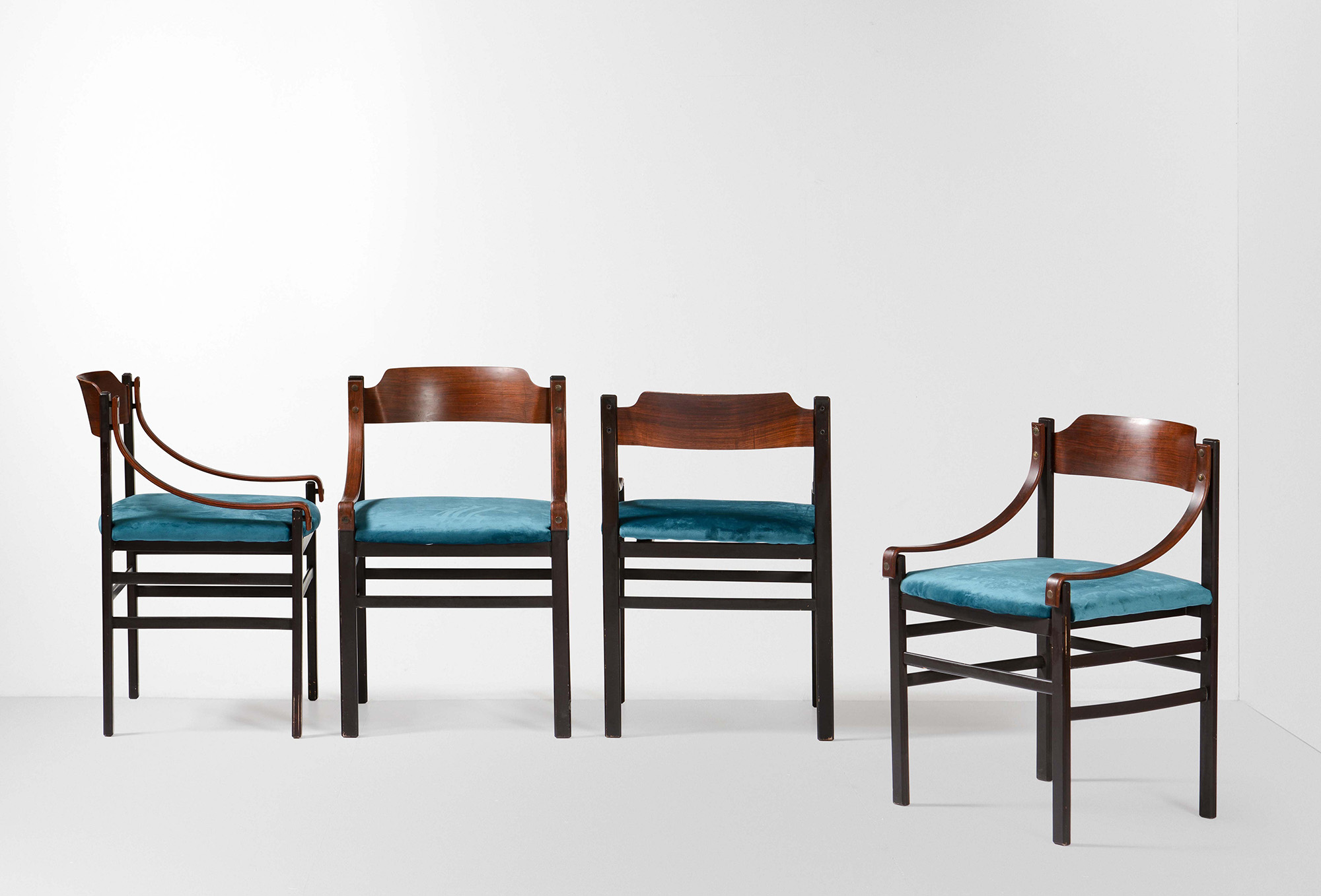 Quattro sedie con struttura, braccioli e sostegni in legno e rivestimento in velluto., Prod. Italia, 1950 ca. cm 50x50x76