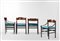 Quattro sedie con struttura, braccioli e sostegni in legno e rivestimento in velluto.,