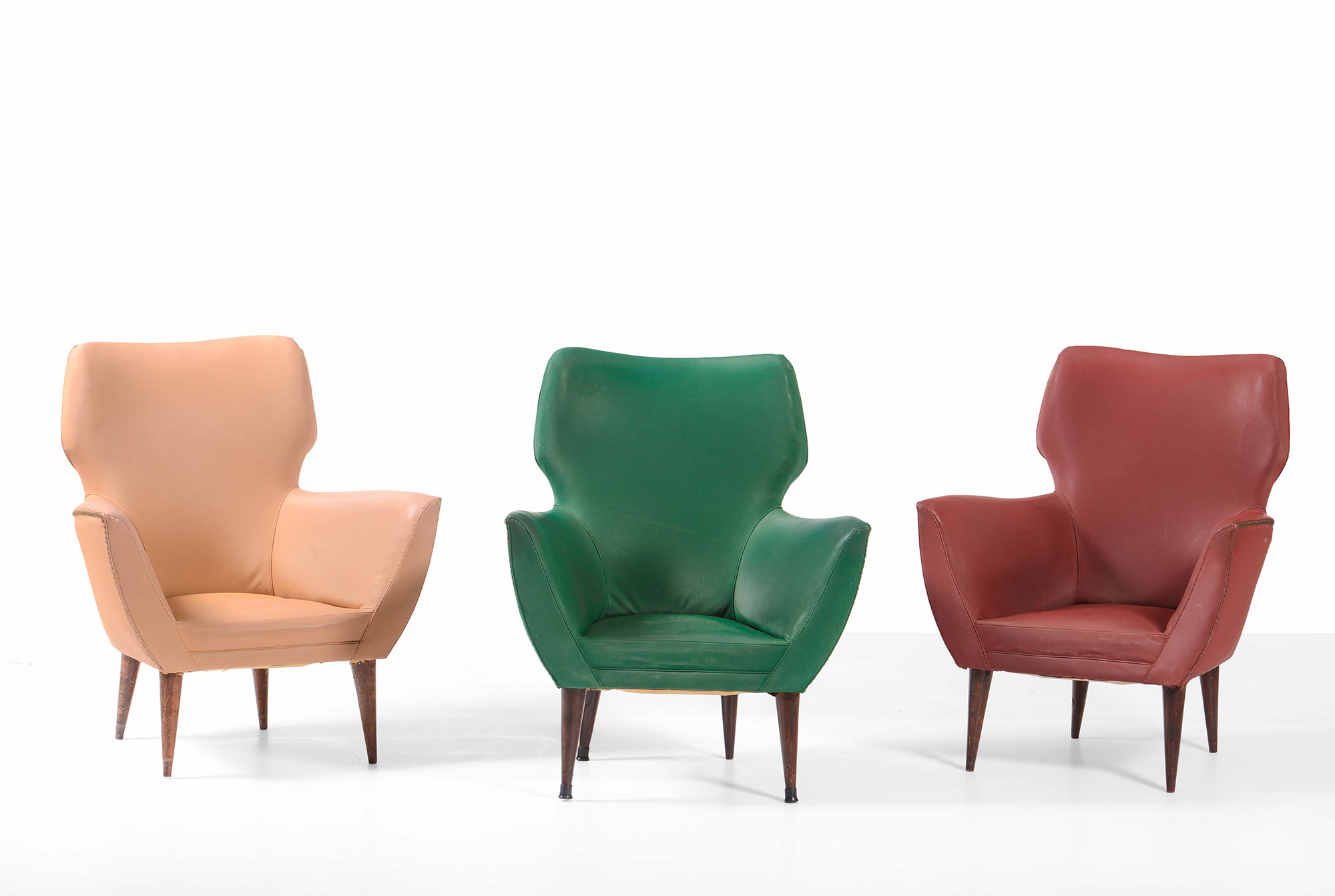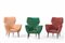 Set di tre poltrone con struttura in legno e rivestimenti in tessuto., Prod. Italia, 1950 ca. cm 71x55x85