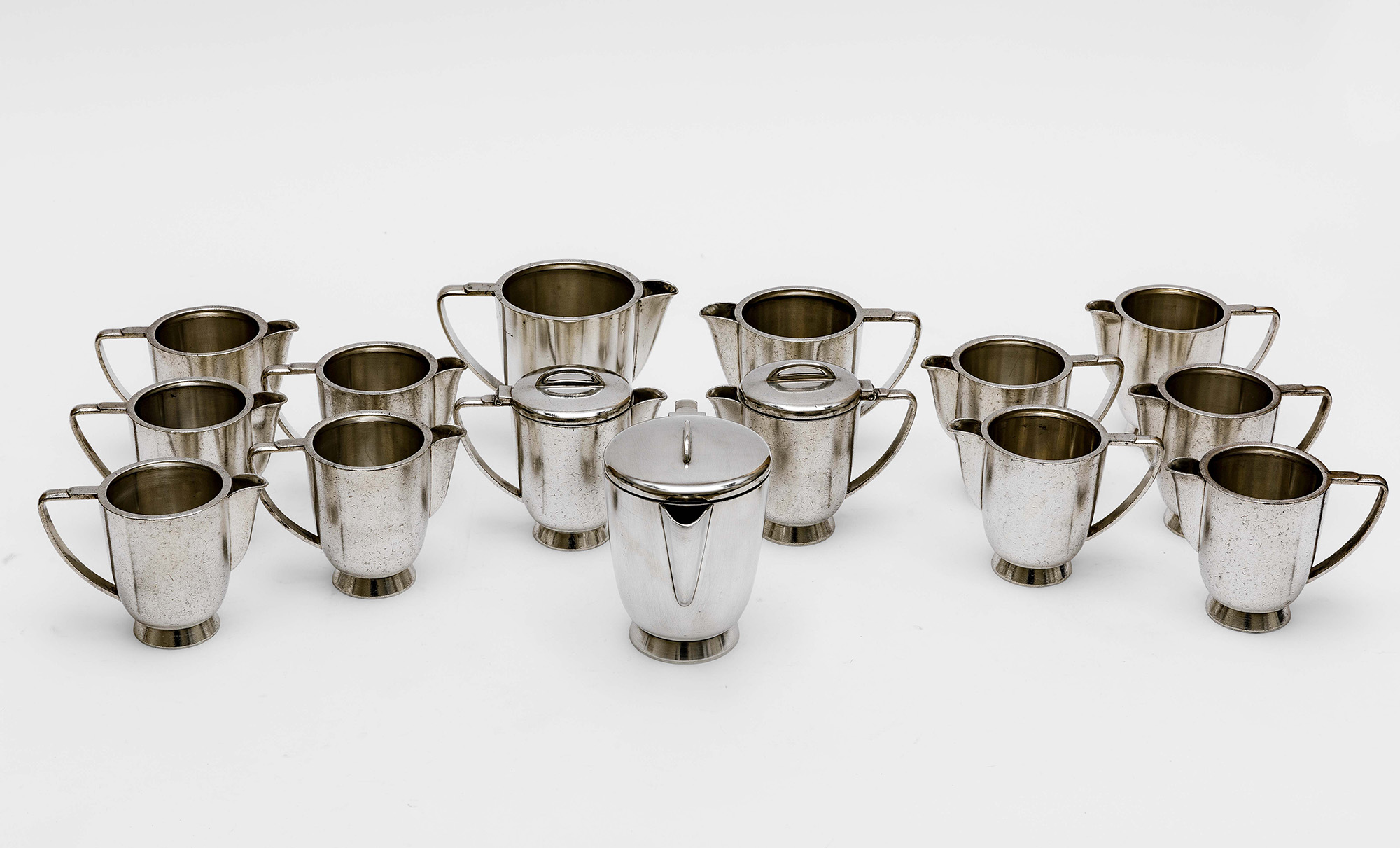 Gio Ponti, Set di quindici elementi assortiti in alpaca argentata. Prod. Italia, 1950 ca. cm. 14x8,5x14; cm 14x8,5x10,5; cm. 13x7,5x9; cm. 12x7x9