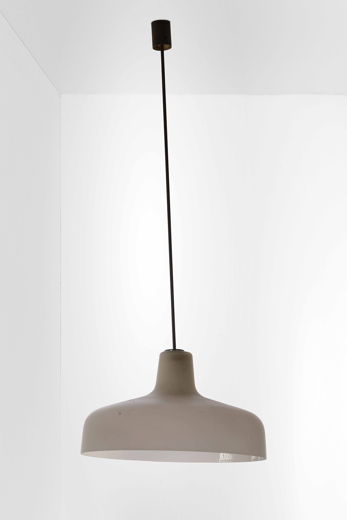 Ignazio Gardella, Lampada a sospensione mod. Paolina con struttura in metallo, diffusore in vetro opalino. Sostegni per coppa inferiore in plexiglass e ottone. Mancante della coppa inferiore in vetro. Prod. Azucena, Italia, 1950 ca. cm 54x133