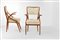Coppia di poltroncine con struttura e braccioli in legno e rivestimenti in tessuto.,