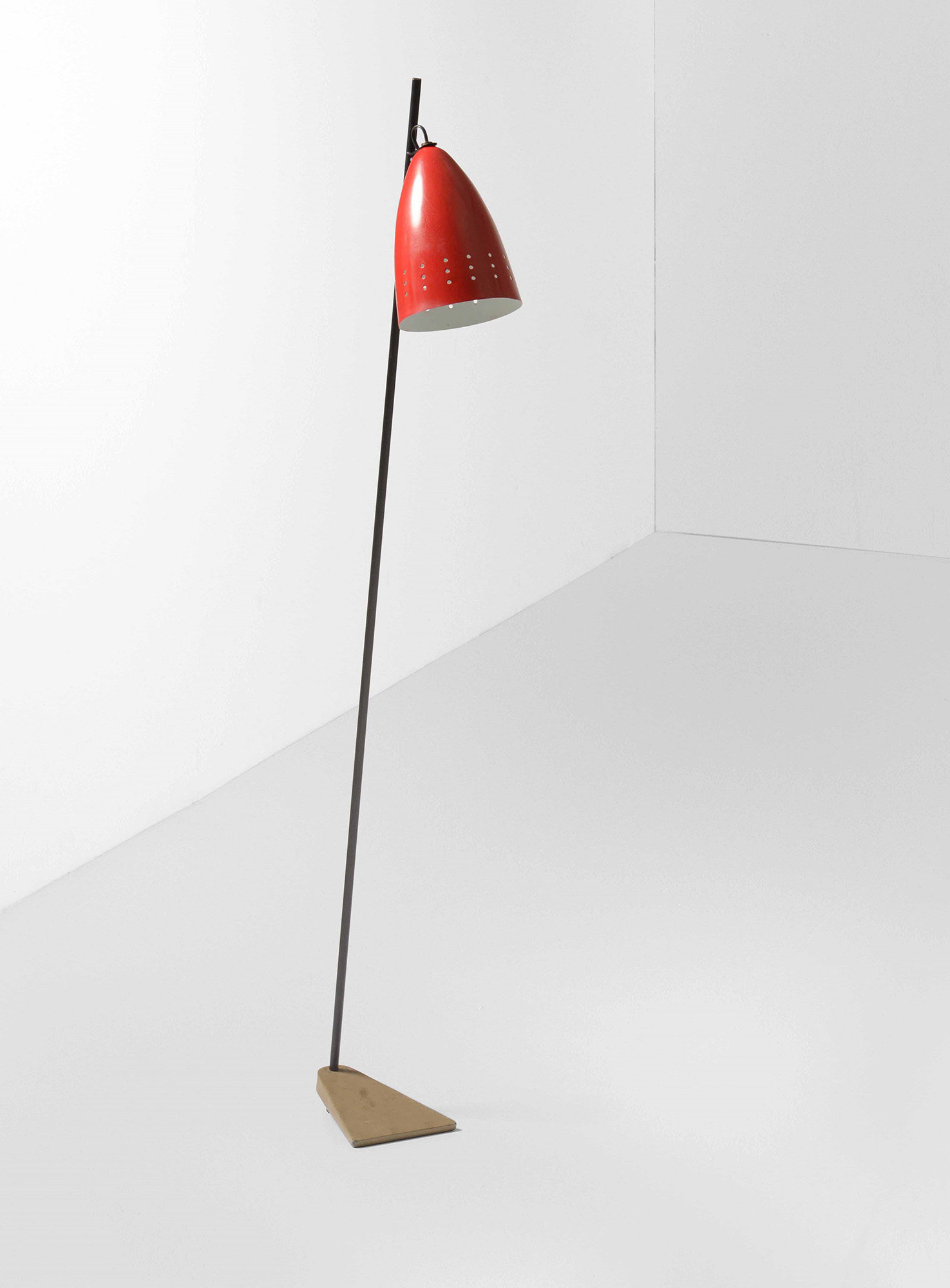 Lampada da terra con struttura in metallo laccato, diffusore in metallo laccato e base in ottone., Prod. Italia, 1950 ca. cm 17x50x146