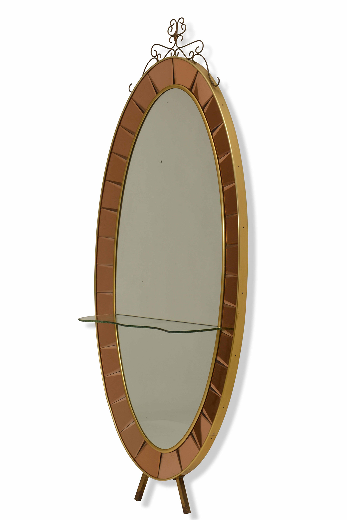 Cristal Art, Grande specchiera a parete con cornice in cristallo colorato e molato. Dettagli in ottone. Mensola in cristallo molato e sagomato. Prod. Cristal Art, Italia, 1950 ca. cm 233x110x28