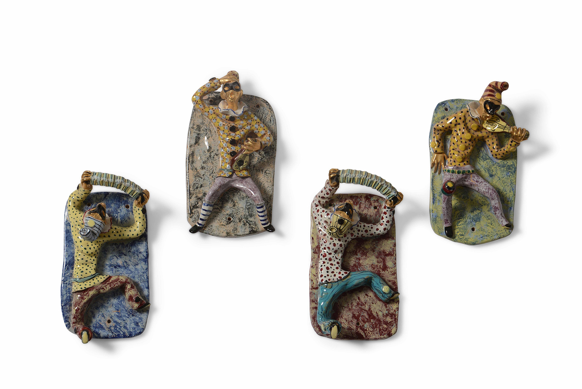 San Polo, Quattro appendiabiti da parete in ceramica smaltata. Firma originale. Prod. Italia, 1950 ca. cm 25x12x8