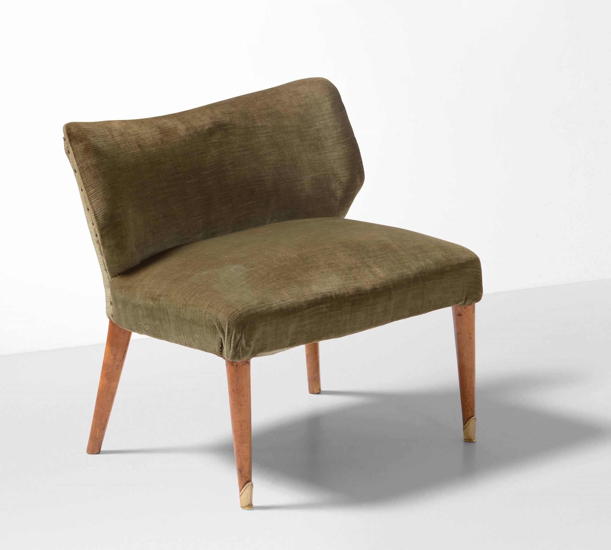 Poltrona da camera con struttura e sostegni in legno e puntali in ottone, Rivestimento in velluto., Prod. Italia, 1950 ca. cm 56x50x57