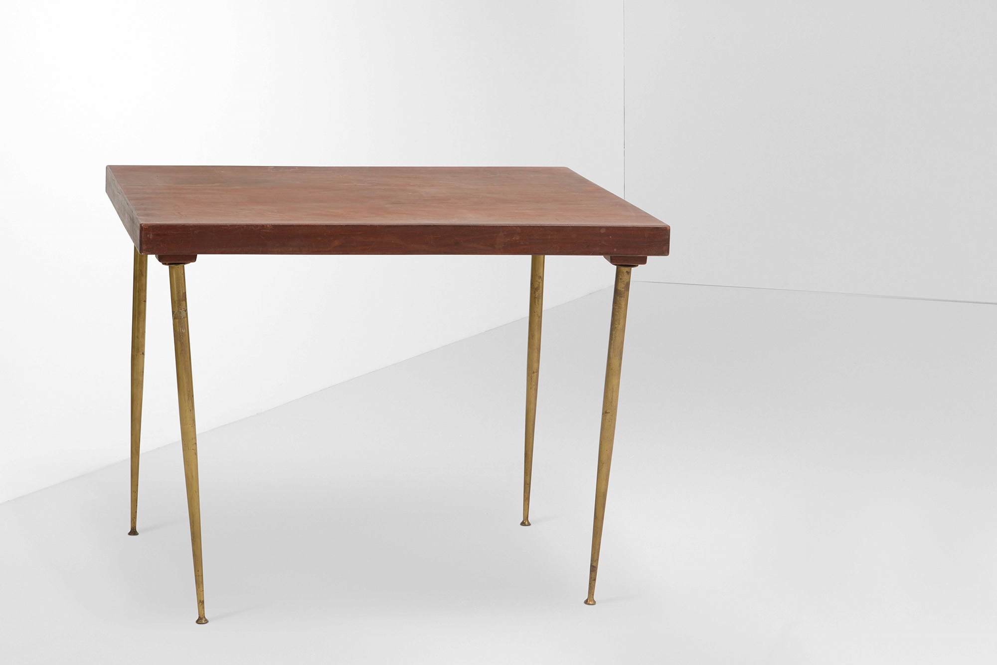 Tavolo basso con piano in legno e sostegni in ottone., Prod. Italia, 1950 ca. cm 100x88x78