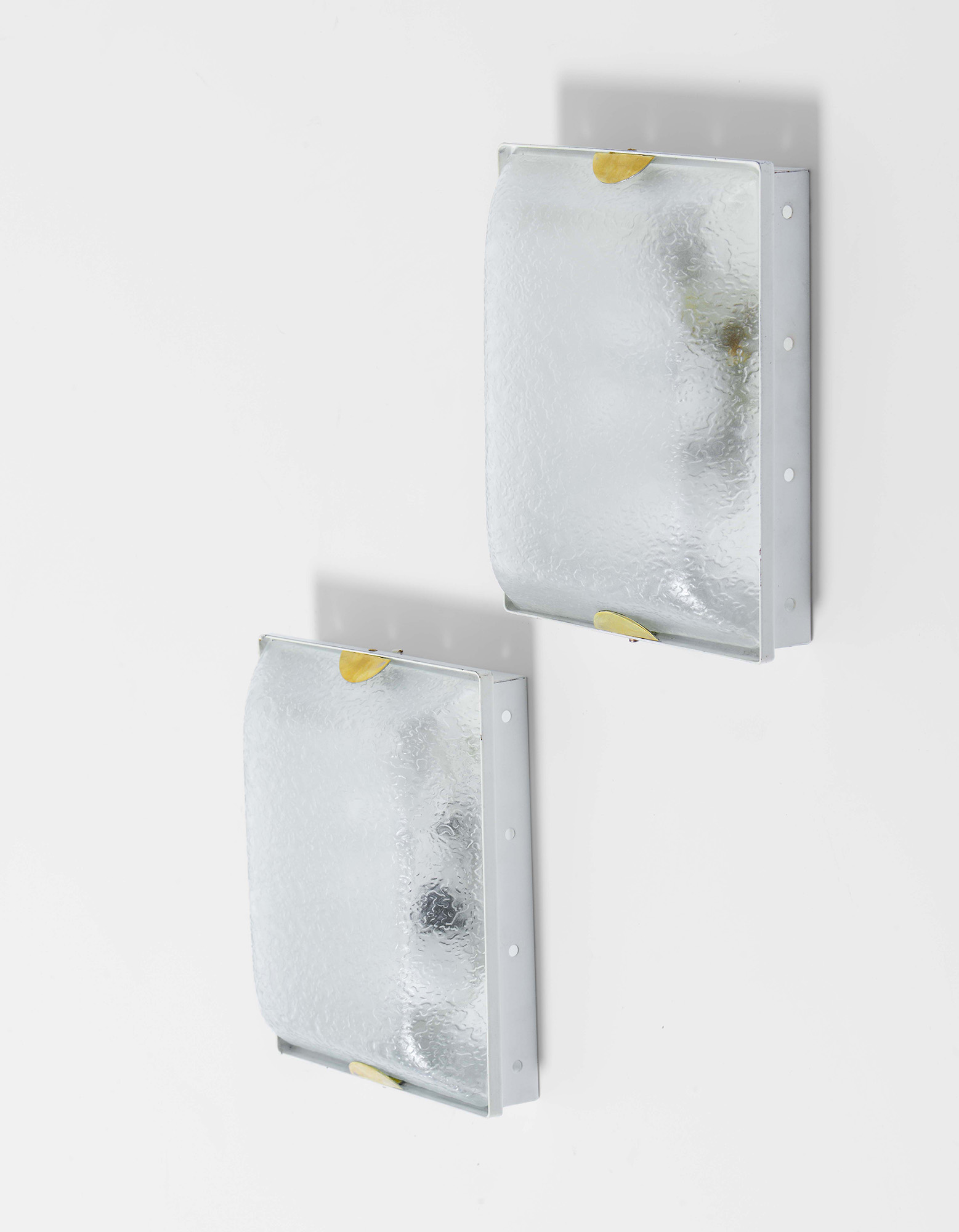 Fontana Arte , Coppia di lampade da parete mod. 1938 con struttura in metallo laccato e ottone. Diffusori in vetro stampato curvato. Prod. Fontana Arte, Italia, 1960 ca. cm 25x20x8 cm 25x20x8