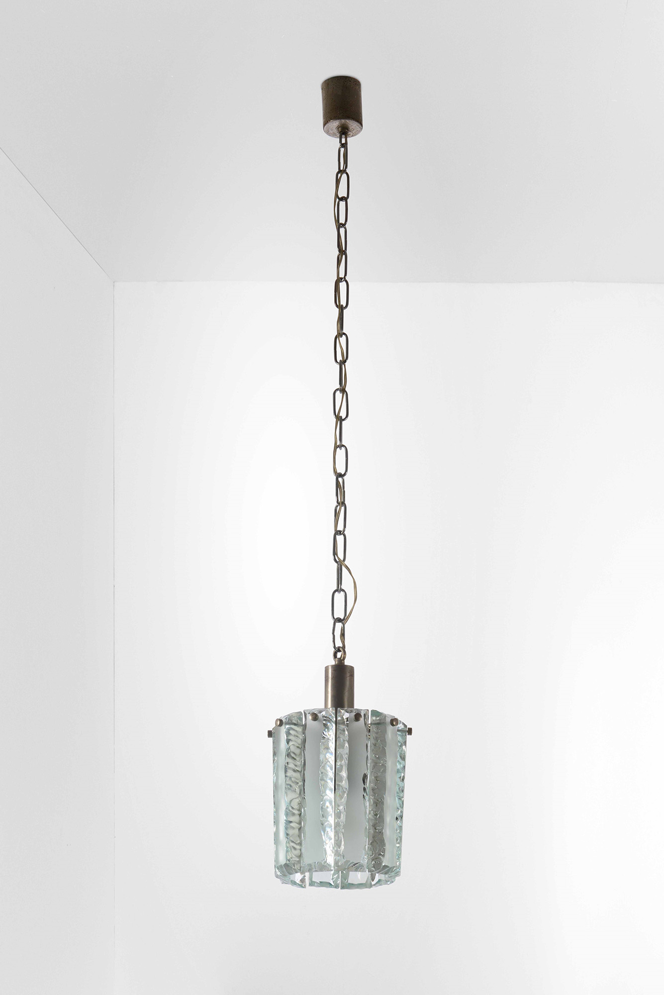 Lampada a sospensione con struttura in ottone nichelato e diffusore in vetro di forte spessore scalpellato., Prod. Italia, 1960 ca. cm 19x105