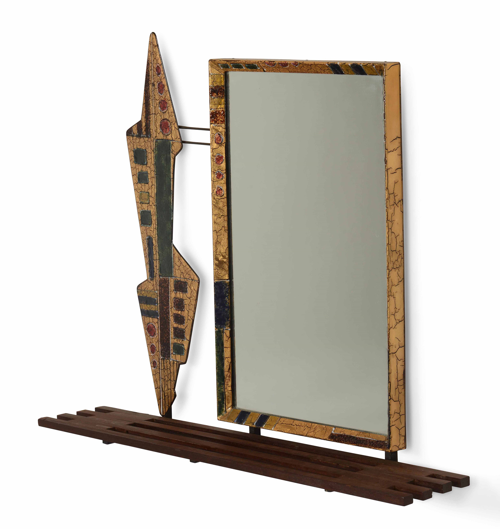 Consolle e specchiera da parete con struttura in legno, cristallo specchiato e smalto a fuoco., Prod. Italia, 1960 ca. cm 99x22x81