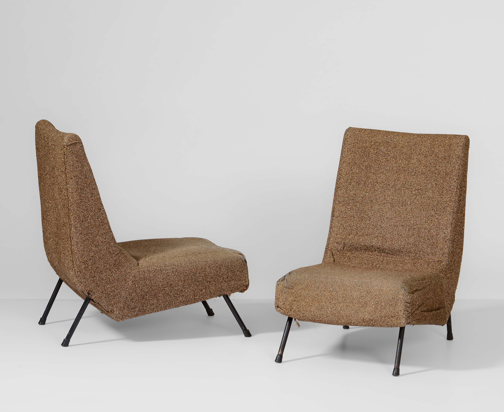 Lotto 161 | Coppia di poltrone con struttura in legno, sostegni in metallo tubolare laccato e rivestimento in tessuto.,