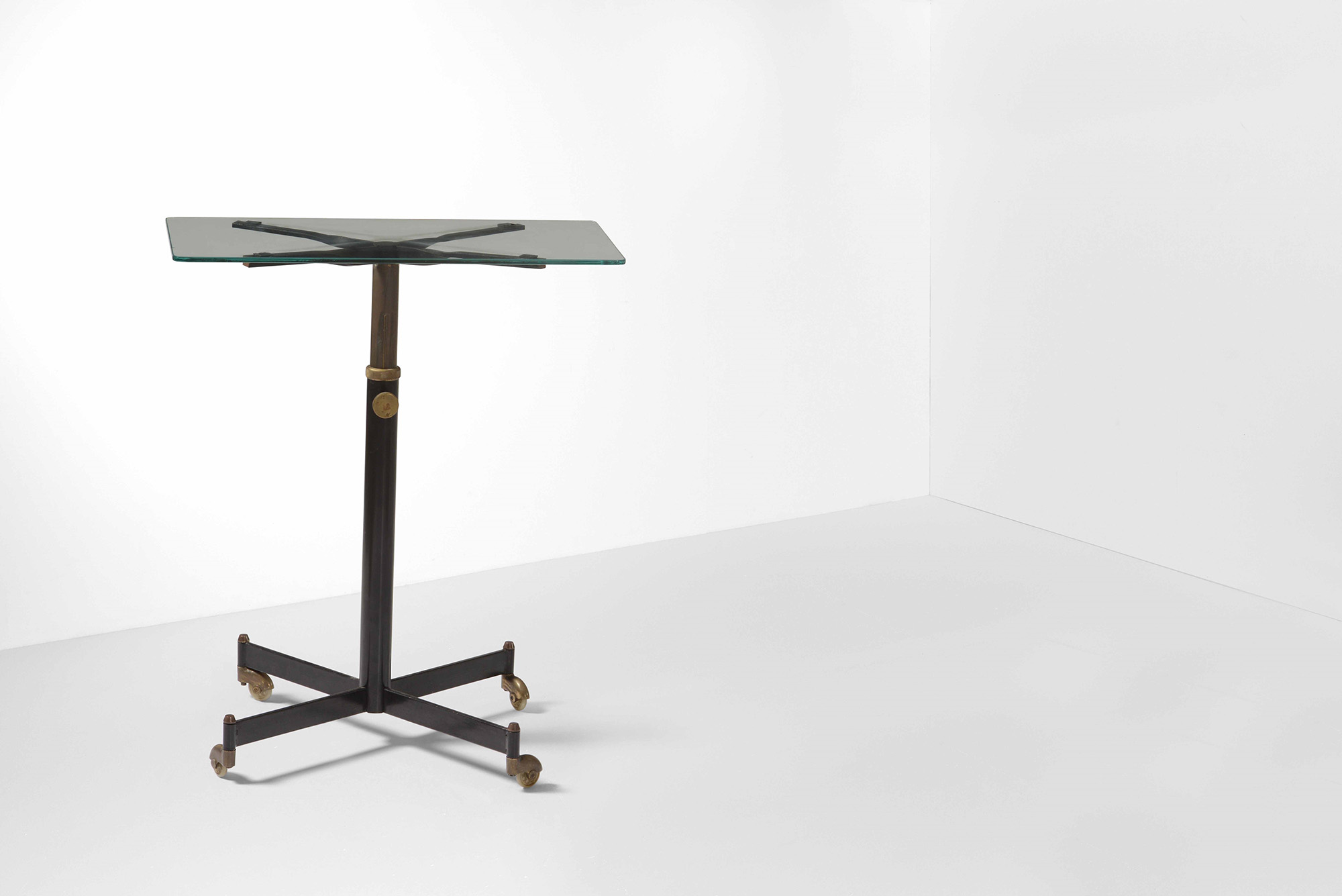 Tavolo occasionale ruote con struttura in metallo laccato e particolari in ottone. Piano in cristallo molato,
