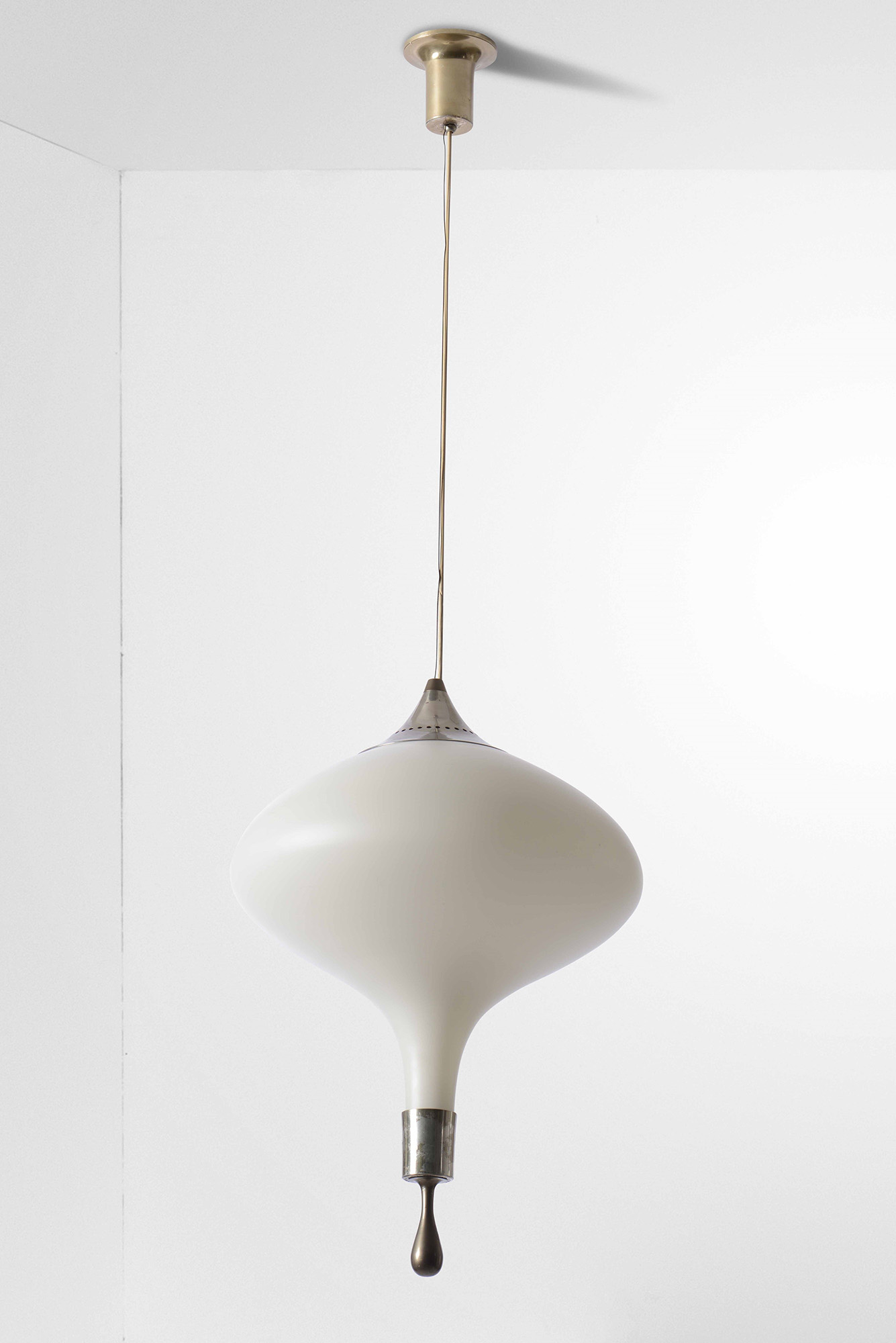 Lampade a sospensione, altezza regolabile, diffusore in vetro opalino, particolari in ottone nichelato., Prod. Italia, 1960 ca. cm 145x43