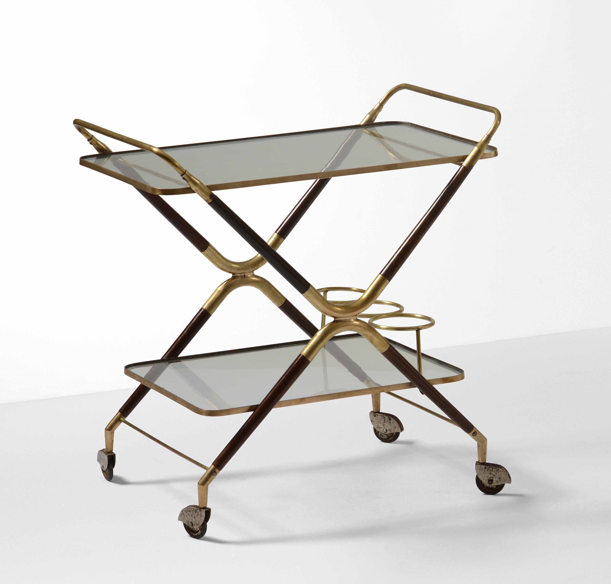 Carrello con struttura in legno e ottone, piani in cristallo molato., Prod. Italia, 1960 ca. cm 70x45x72