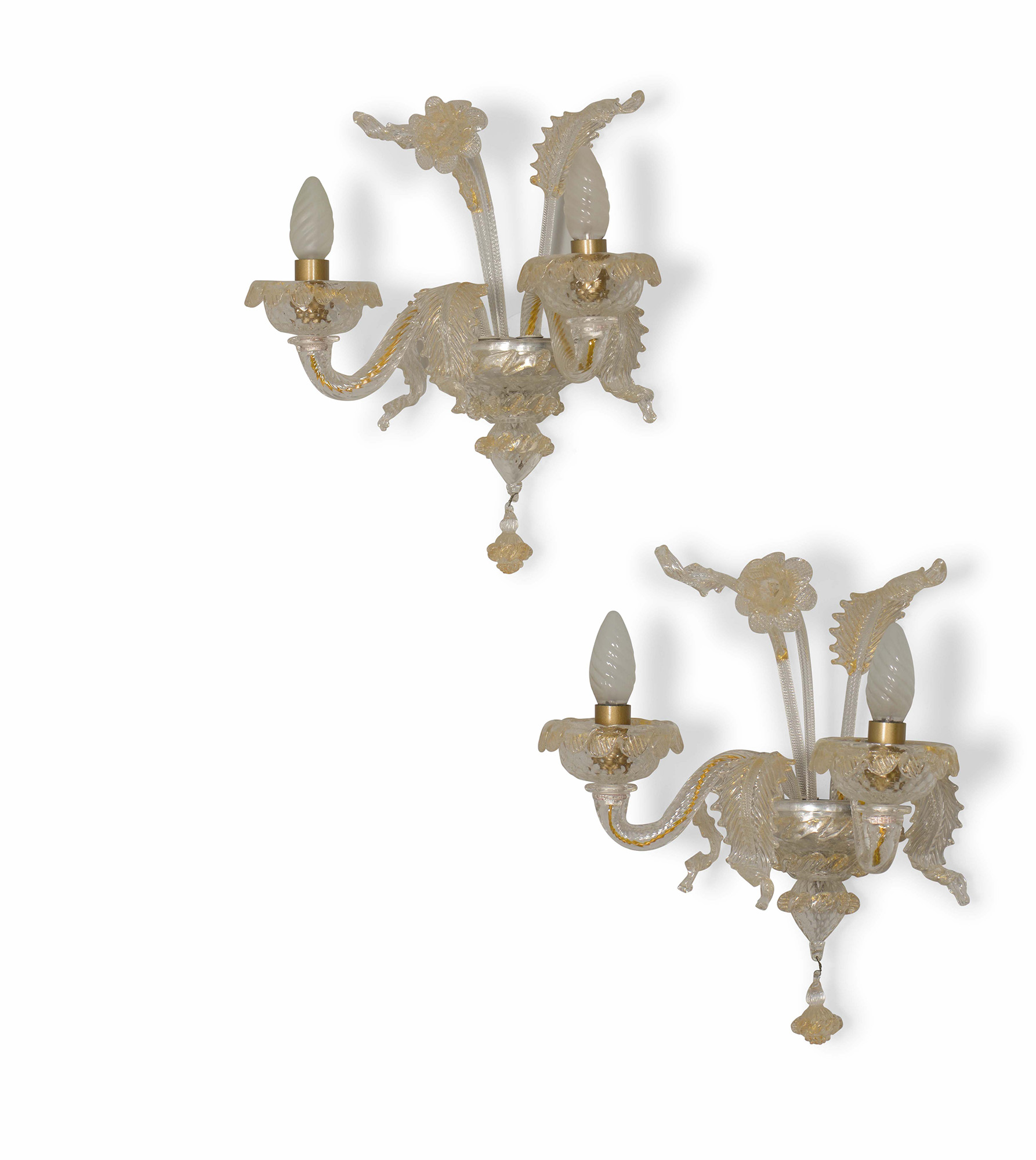 Coppia di lampada da parete in vetro di Murano a foglia oro e particolari in ottone.,
