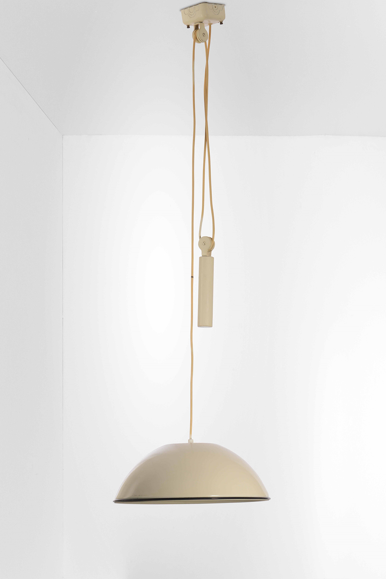 Achille e Piergiacomo Castiglioni, Lampada a sospensione mod. Relemme con sistema saliscendi , struttura e diffusore in metallo laccato. Etichetta originale. Prod. Flos, Italia, 1962 cm 38,5x175 H max