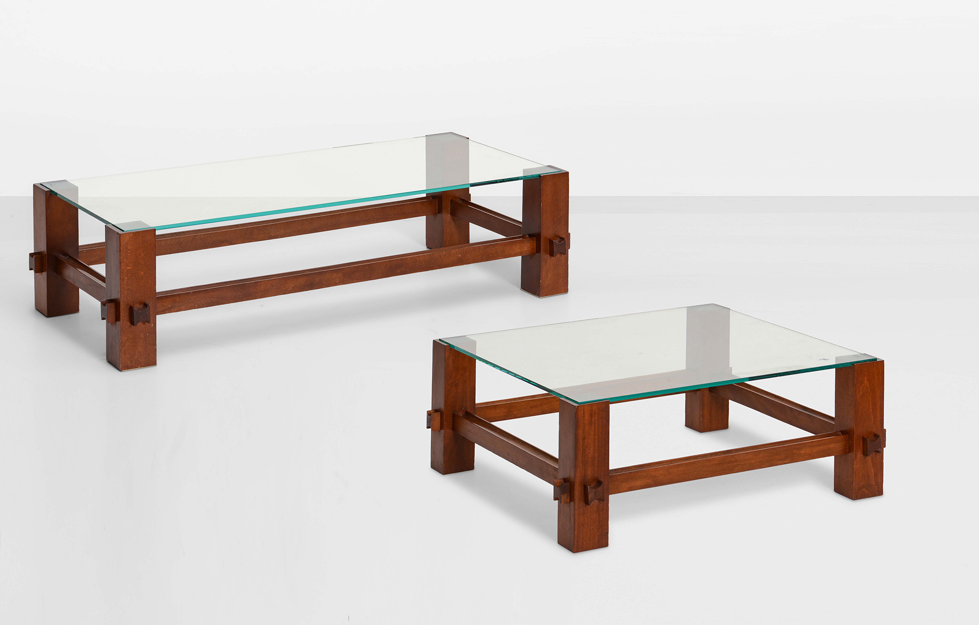 Fontana Arte, Due tavoli bassi mod. 2461 con struttura in legno e piano in cristallo molato. Prod. Fontana Arte, Italia, 1960 ca. cm 122,5x54x32; cm 82x82x32