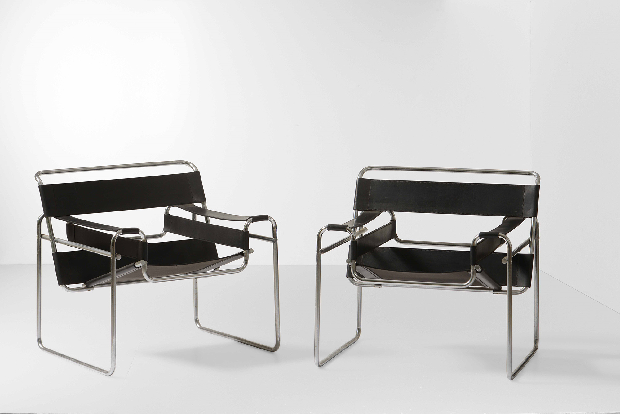 Marcel Breuer, Coppia di poltrone mod. Wassily in tubo di acciaio curvato e nastri di cuoio. Prod. Gavina, Italia, 1968 (disegno del 1925). cm 78x70x75