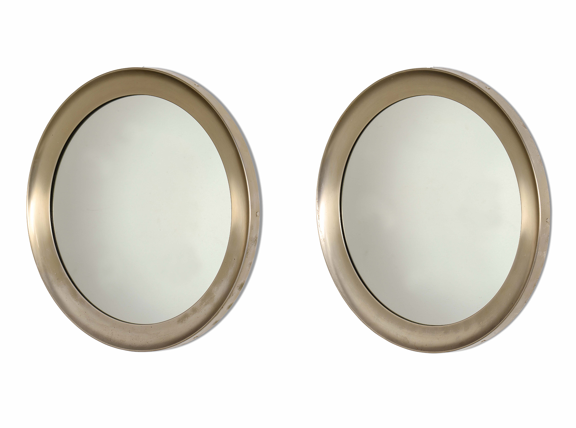 Sergio Mazza, Coppia di specchiere a parete mod. Narciso con struttura in metallo laccato, cornice in alluminio e cristallo specchiato. Prod. Artemide, Italia, 1960 ca. cm 83x5