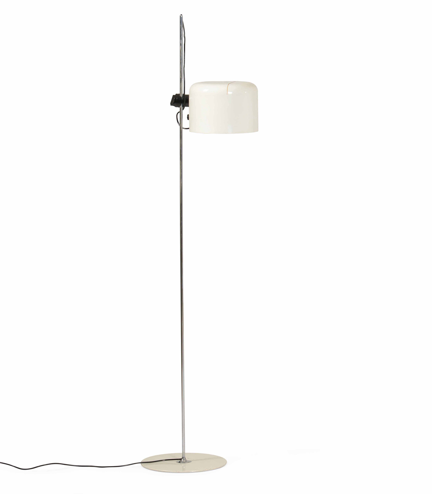 Joe Colombo, Lampada da terra mod. Coupé con struttura in metallo cromato e riflettore in metallo laccato. Prod. Oluce, Italia, 1960 ca. cm 37x28x145