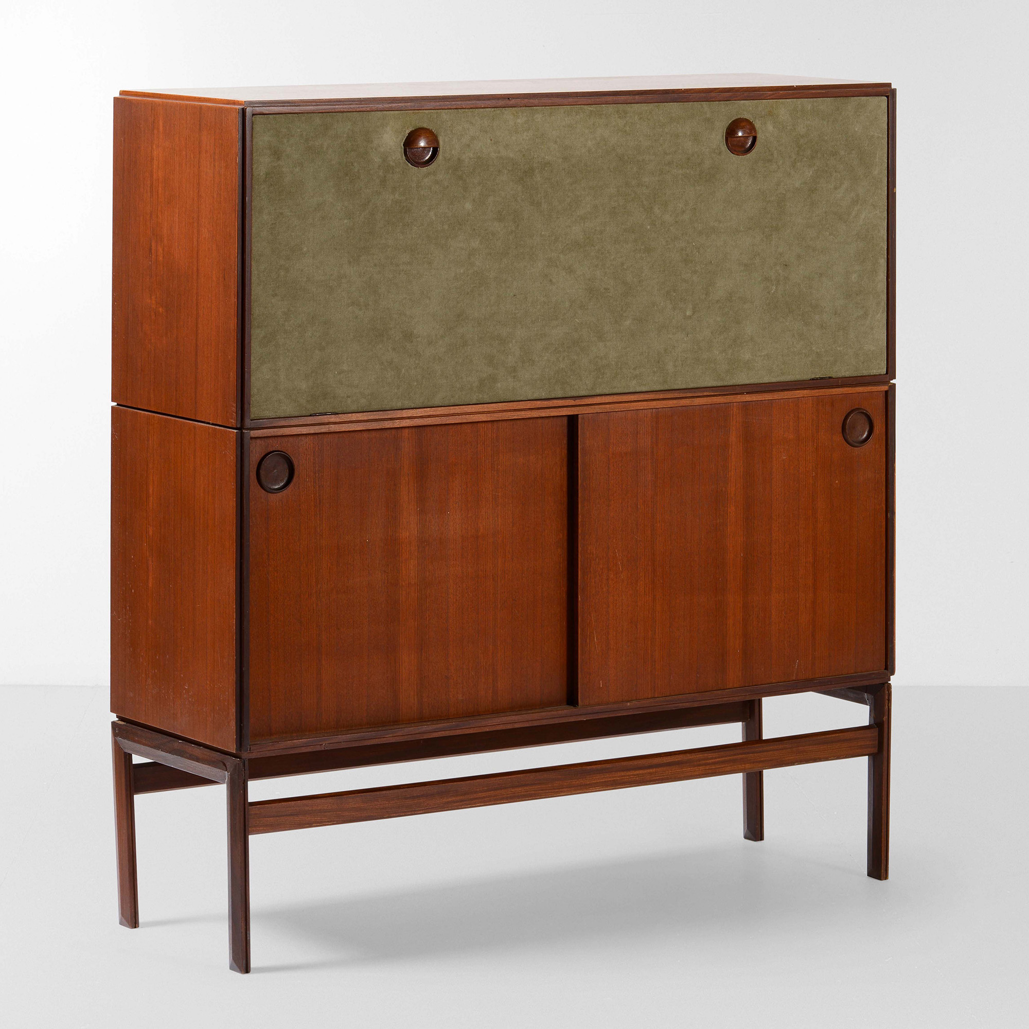 Mobile contenitore con struttura, sostegni e piano in legno e rivestimento in tessuto., Prod. Italia, 1960 ca. cm 114x41x123