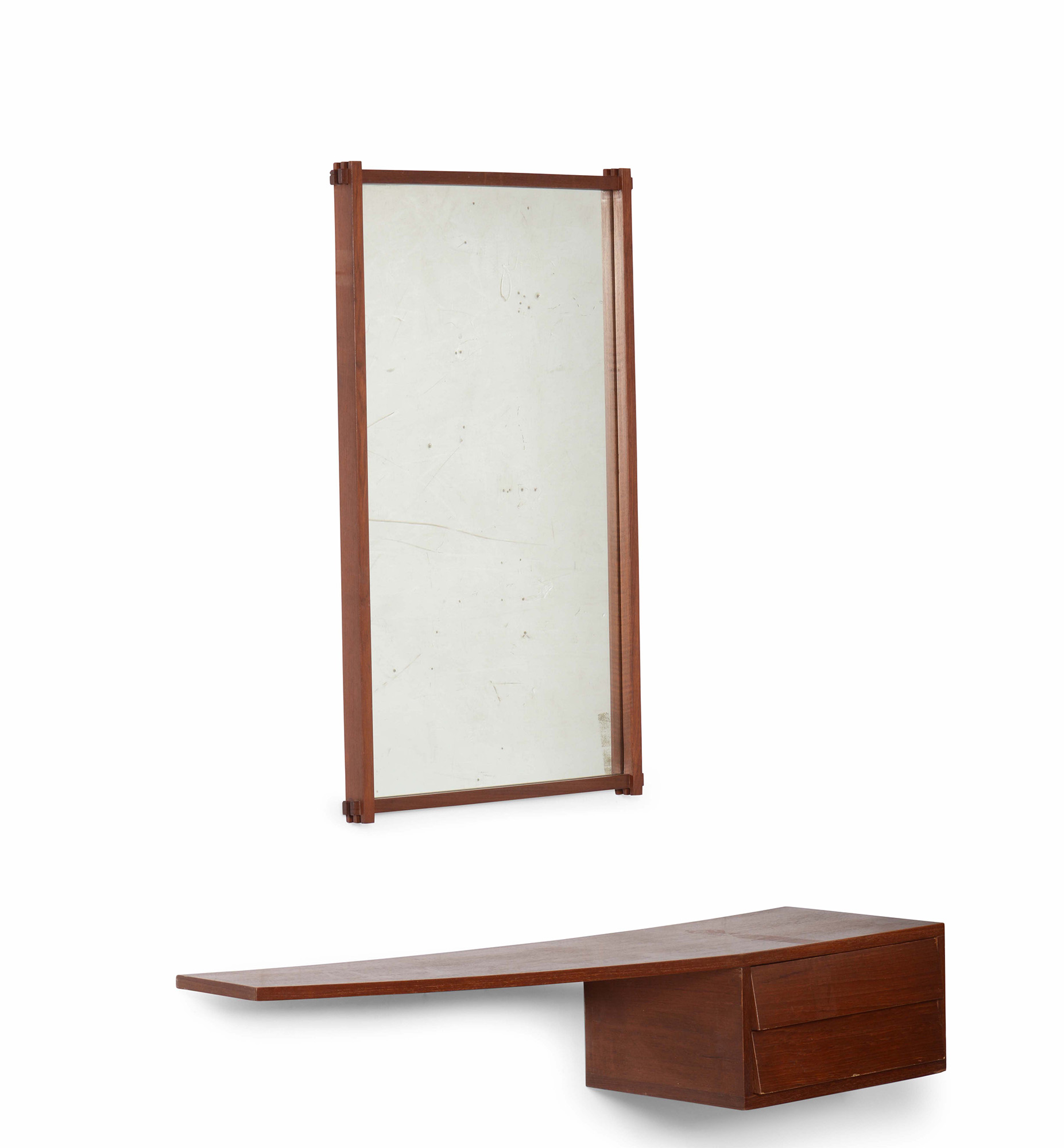 Consolle e specchio con struttura in legno e cristallo specchiato., Prod. Italia, 1960 ca. consolle cm 119x33x23; specchiera cm 92x56