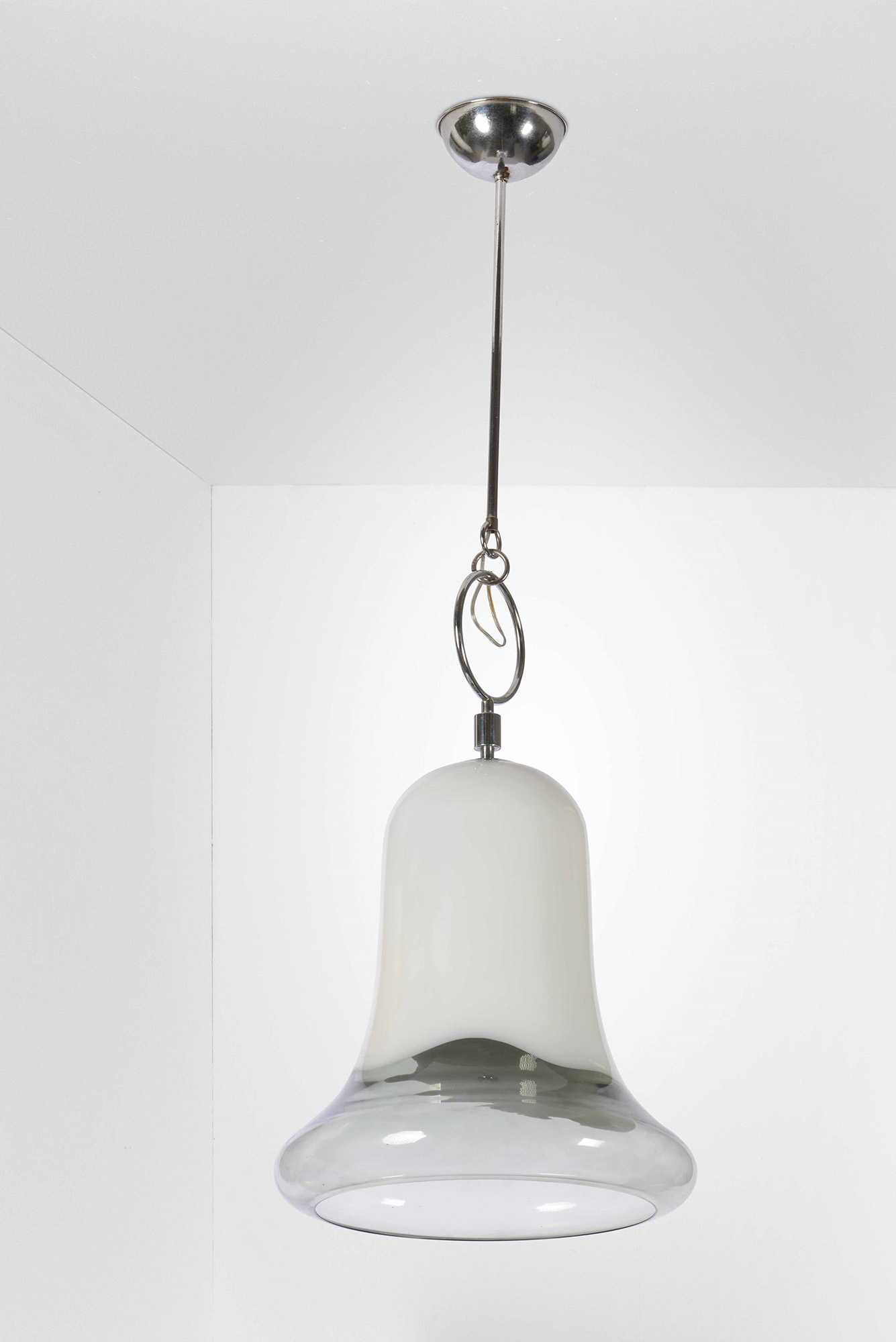 Angelo Brotto, Lampada a sospensione con struttura in metallo cromato e diffusore in vetro di Murano. Etichetta originale. Prod. Esperia, Italia, 1970 ca. cm 105x37