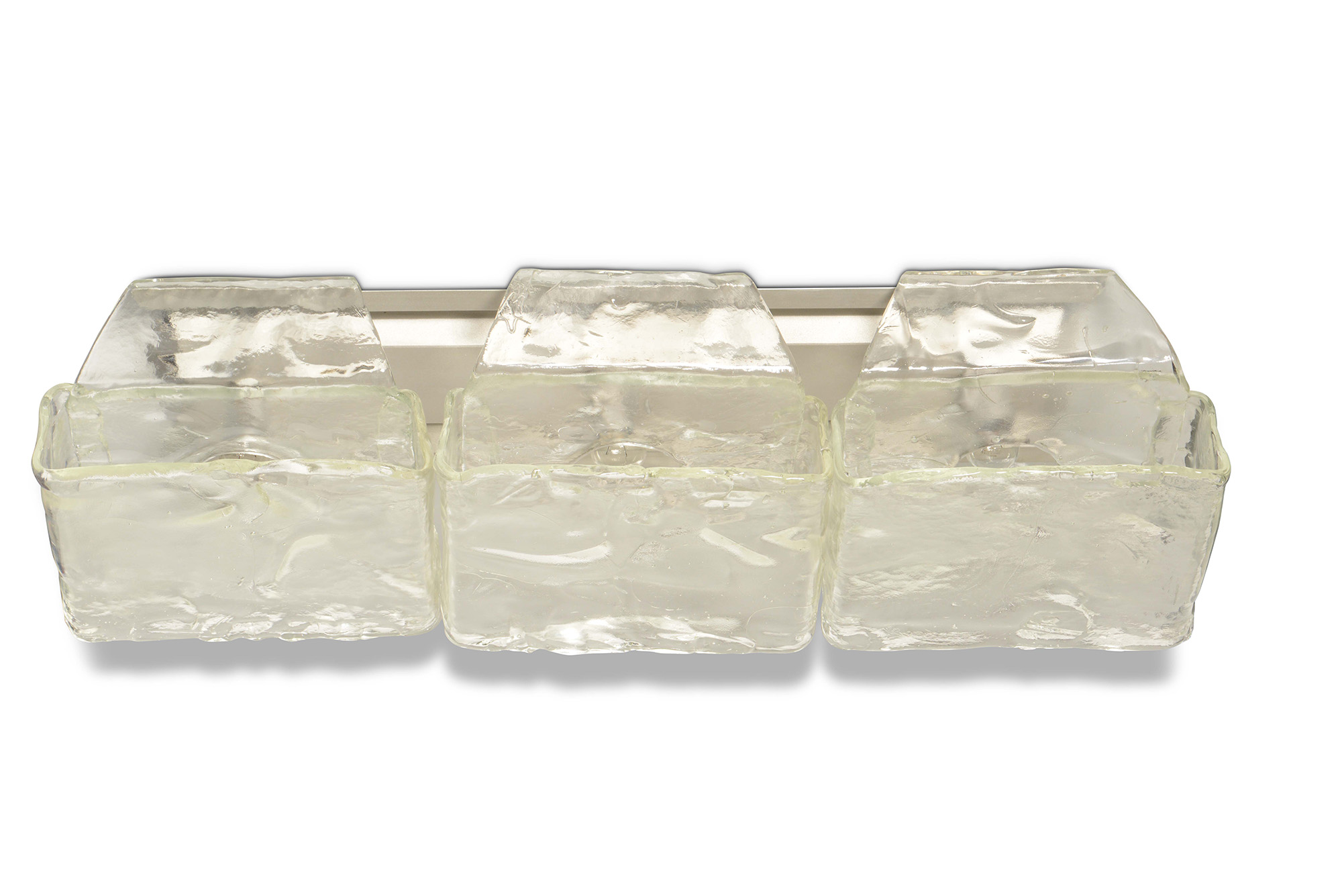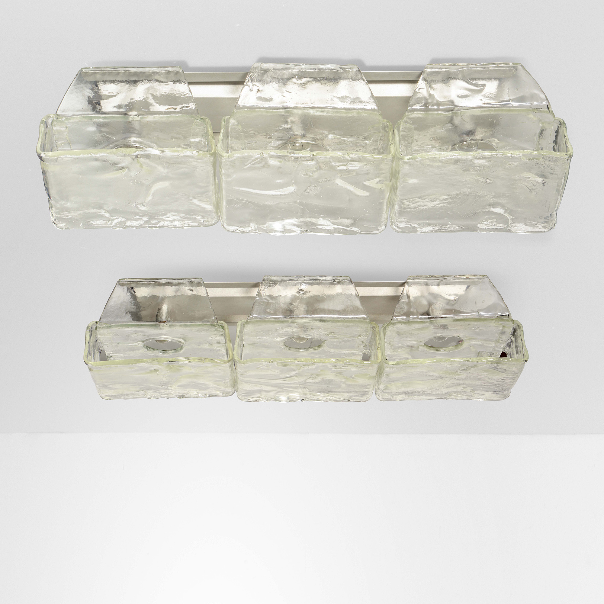 AV Mazzega, Coppia di lampade a plafone con struttura in metallo ed elementi diffusori in vetro di Murano. Prod. AV Mazzega, Italia, 1970 ca. cm 90x30x24