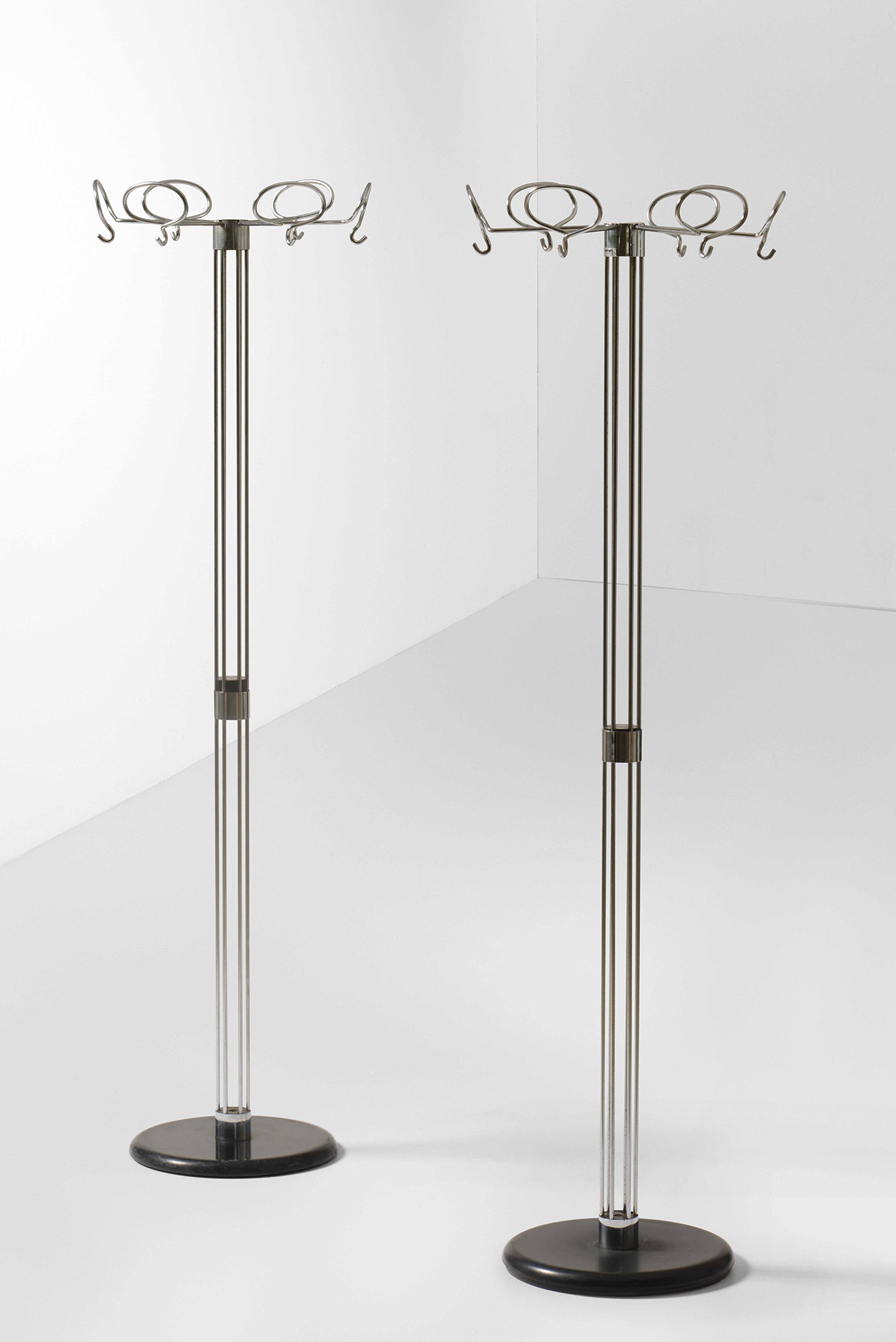 Valenti, Coppia di appendiabiti in metallo cromato e base in ABS. Prod. Italia, 1970 ca. cm 47x170