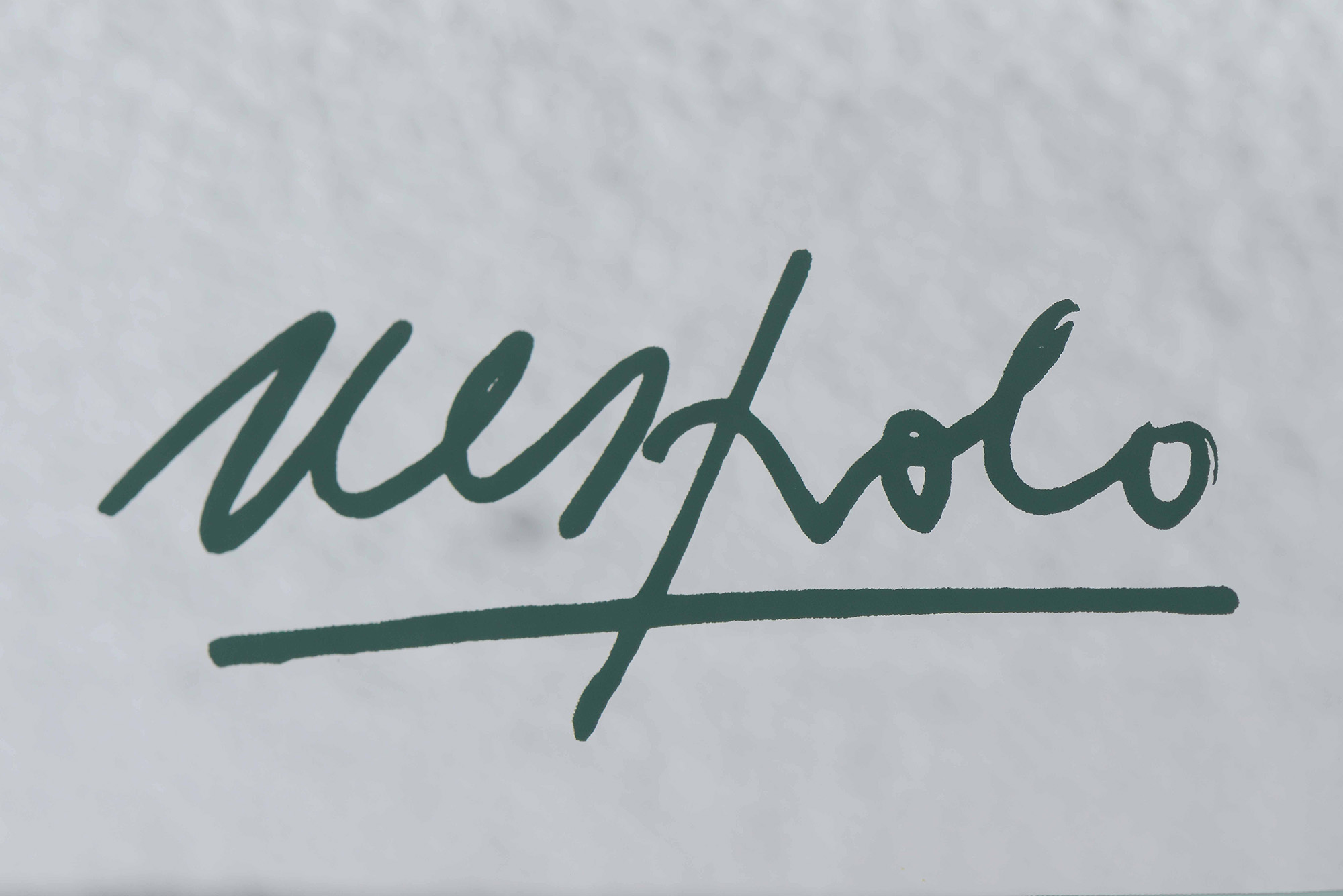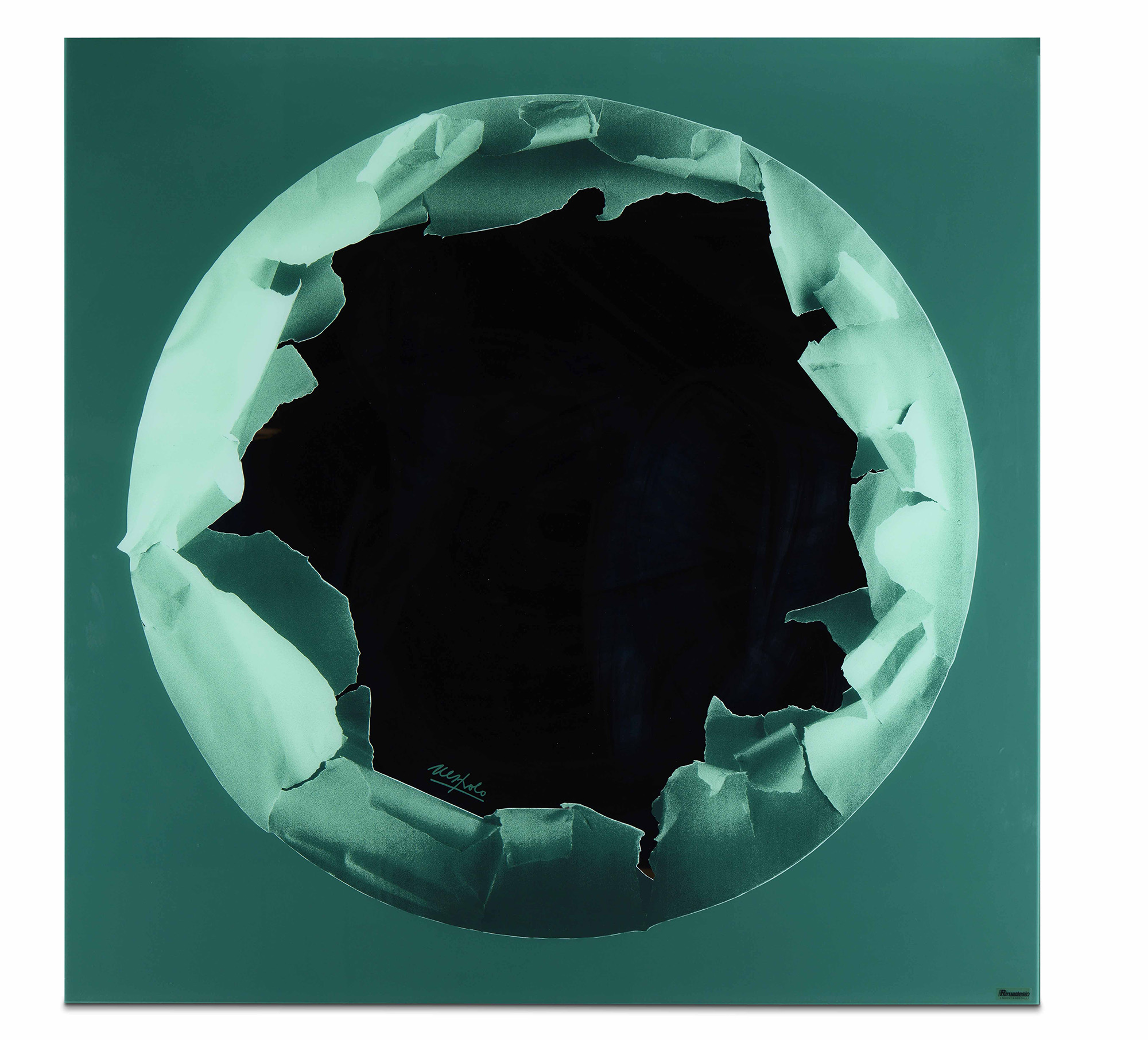 Ugo Nespolo, Specchio a parete in vetro serigrafato e vetro specchiato. Etichetta originale. Prod. Rimadesio, Italia, 1980 ca. cm 120x120