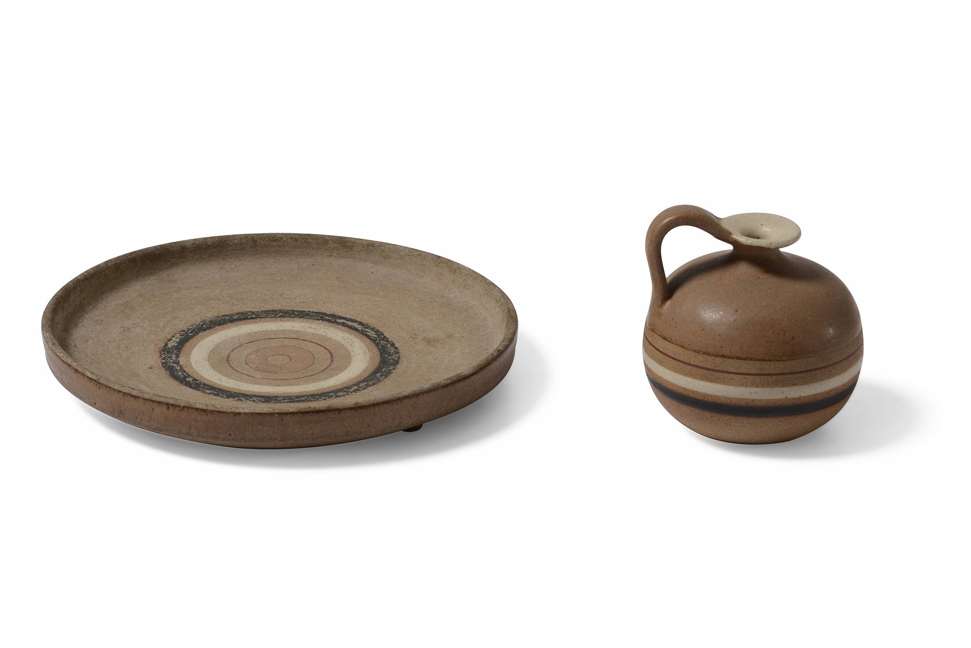Bruno Gambone, Set di brocca con largo piatto fondo in ceramica. Firma originale. Prod. Italia, 1980 ca. piatto cm 28,5x4; brocca cm 13x14