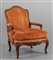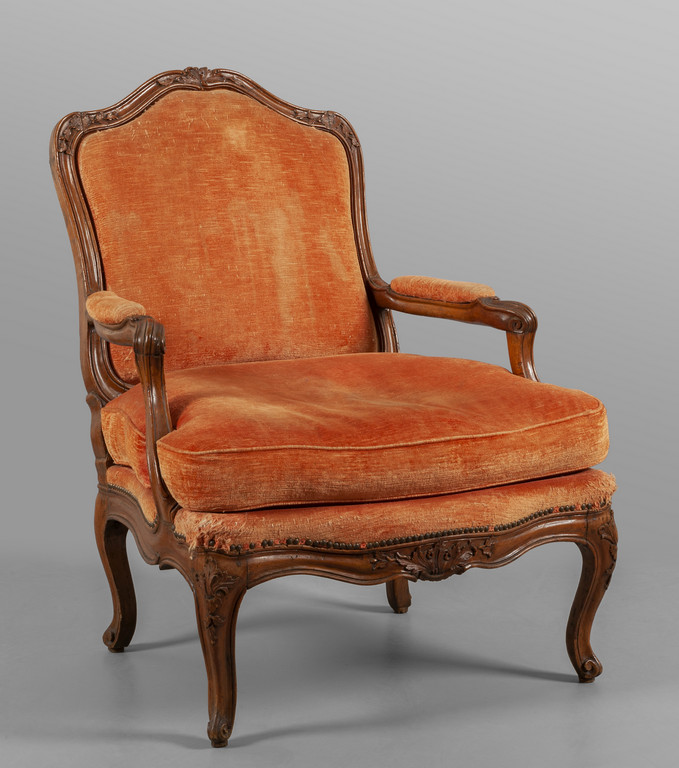 Poltrona Luigi XV in noce intagliata con il motivo della pellaccia ripetuto sul fronte e sui lati dello schienale e del sedile Genova metà sec.XVIII
