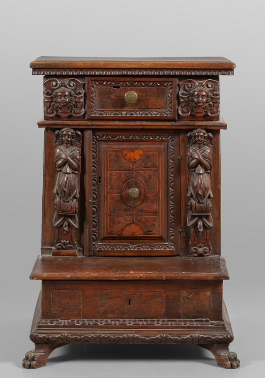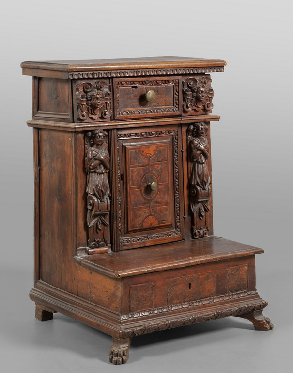 Inginocchiatoio ad uno sportello ed un cassetto parte inferiore con ribalta montanti scolpiti a bambocci Bergamo sec.XVII