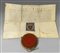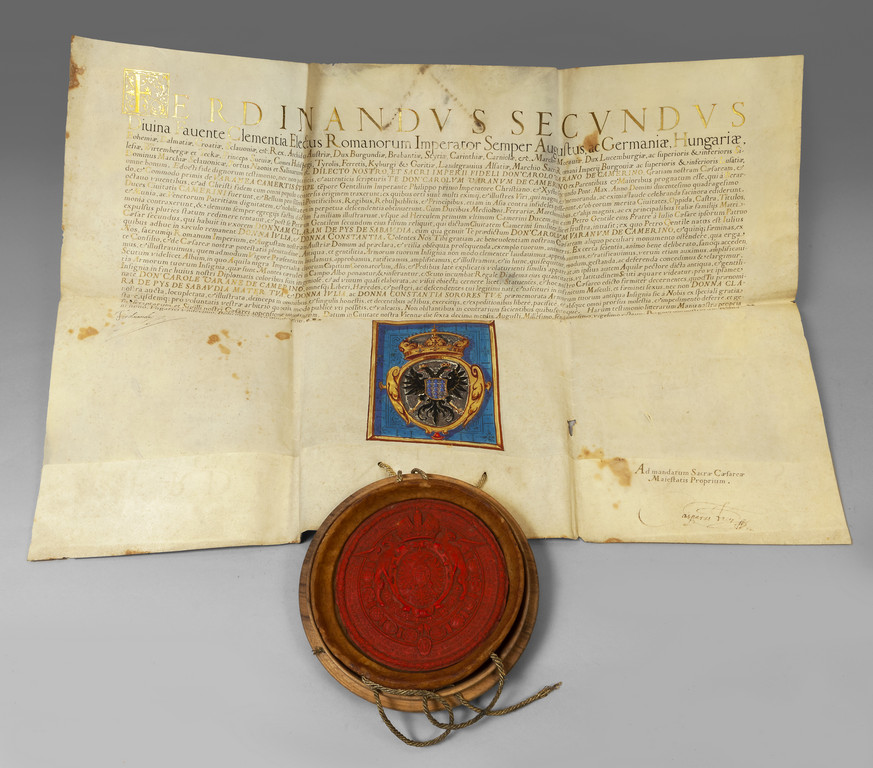 Grande ceralacca da investitura entro il suo contenitore in legno accompagnata da pergamena con miniatura edita da Ferdinando II e datata Vienna 1624