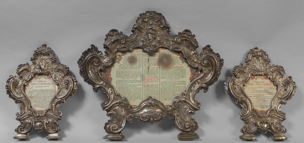 Trittico di cantaglorie Luigi XV in argento finemente sbalzato quella centrale con raffigurazione dell'Immacolata d.ta 1765 Genova sec.XVIII
