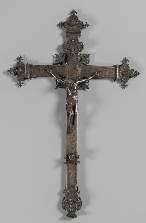 Crocefisso in argento niellato poggiante su Croce in argento a doppia faccia con terminali con teste di angeli Venezia sec.XVII