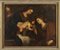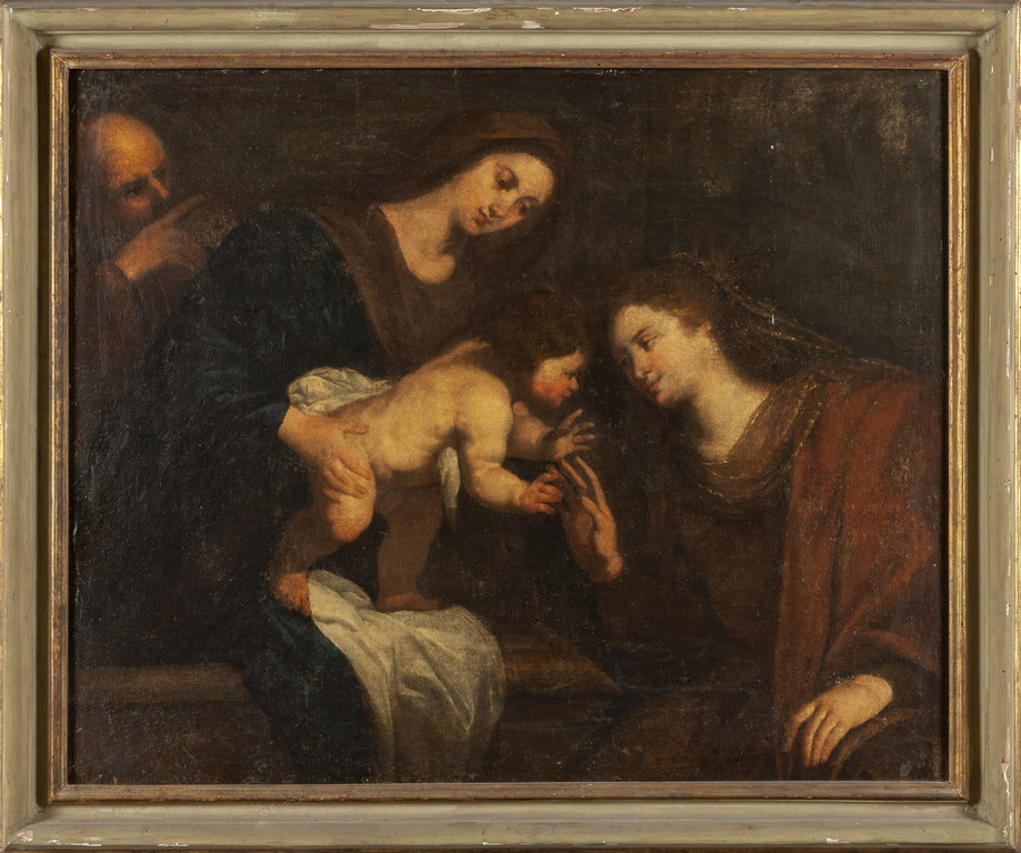 Scuola genovese sec.XVII 'Sacra Famiglia con Santa Caterina' olio antica cornice in legno laccato e dorato