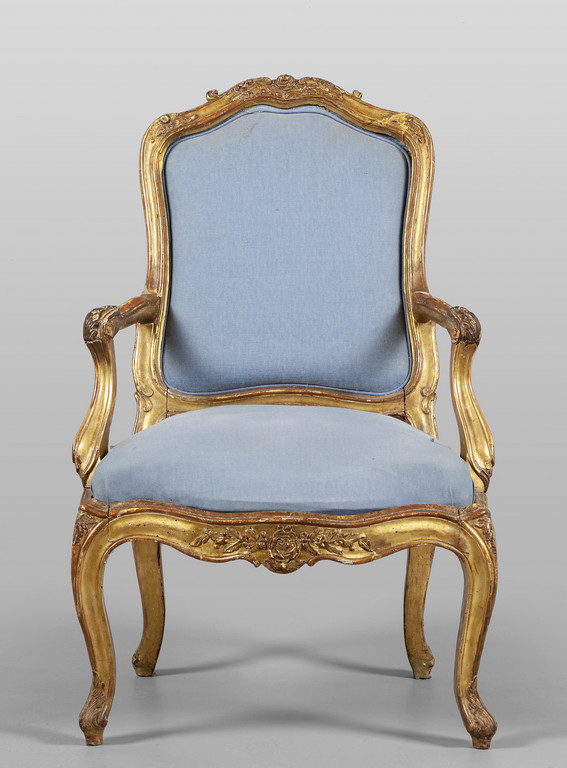 Poltrona Luigi XV in legno finemente intagliato e dorato motivo della pellaccia sul fronte sullo schienale e sui braccioli Genova metà sec.XVIII