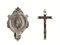 Acquasantiera, Firenze, prima metà sec. XIX, facitore Guadagni, in argento di forma ovale, al centro raffigurazione del Battesimo di Gesù realizzata a sbalzo, cornice decorata da volute e foglie, coppetta per acquasanta cesellata a foglie, g 40 ed un piccolo Crocefisso, in argento montato su croce in legno, cm 22x11 (2)