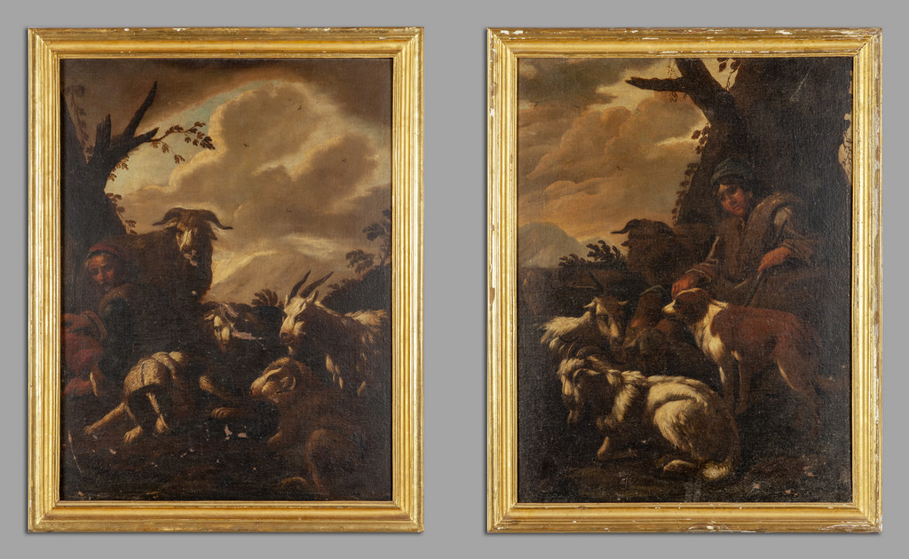 Scuola napoletana sec.XVIII 'Paesaggi animati' coppia di olii cornici coeve in legno intagliato e dorato