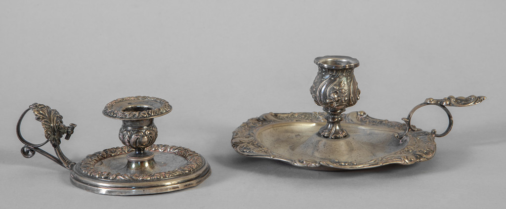Bugia in argento finemente sbalzato Milano inizi sec.XIX (cm.13xh.5) e bugia in argento sec.XX (cm.20xh.7)