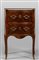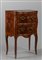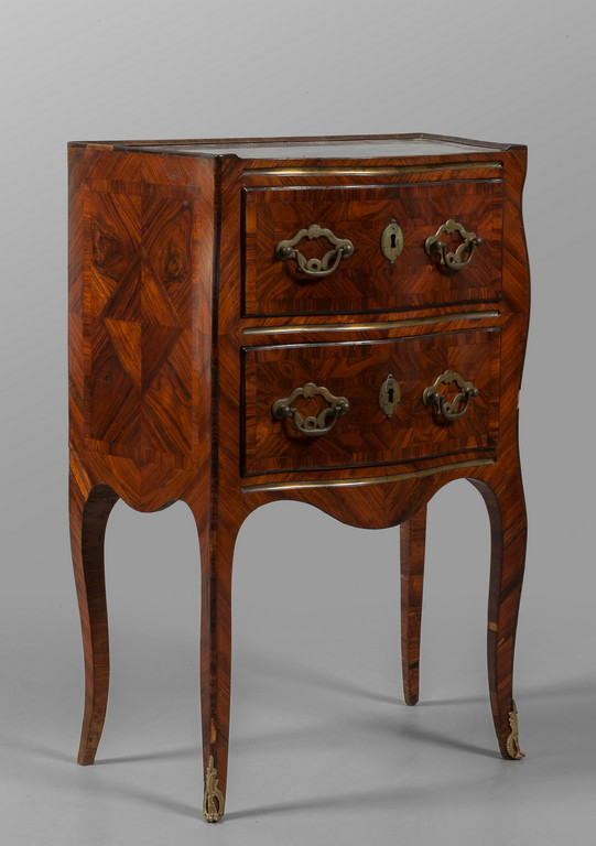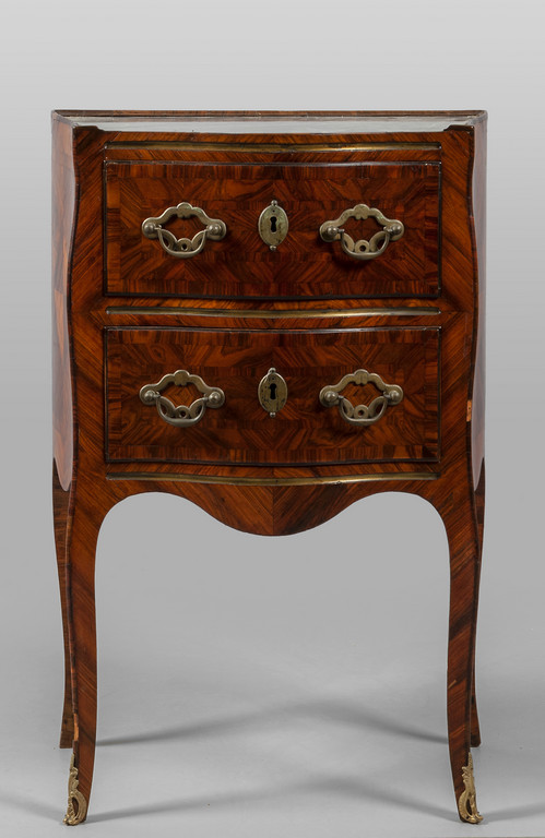 Comodino Luigi XIV lastronato in legno di viola movimentato sul fronte e sui fianchi due cassetti pianetto superiore in marmo Sicilia I metà sec.XVIII