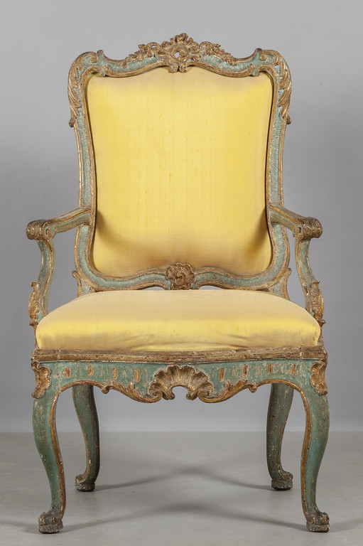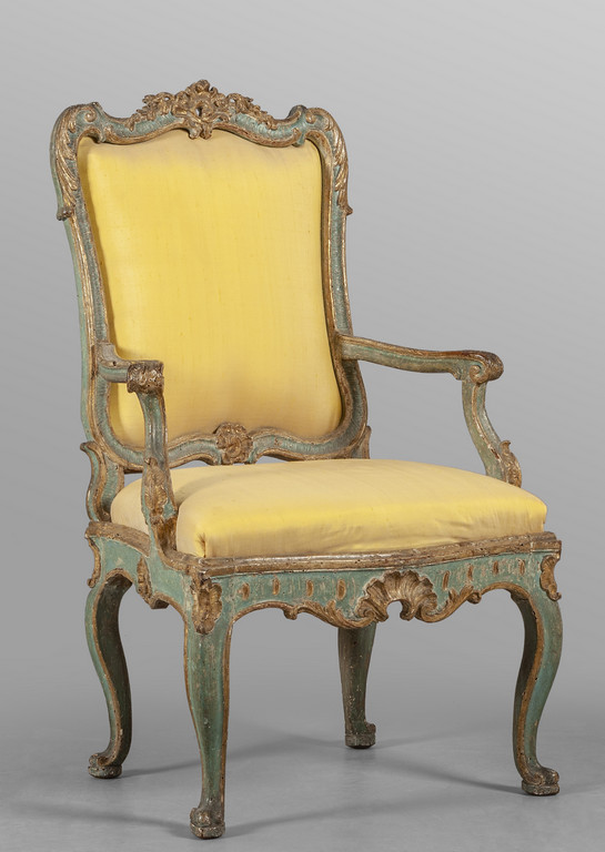 Poltrona Luigi XIV in legno finemente intagliato e laccato in azzurro con motivi dorati Centro Italia sec.XVIII