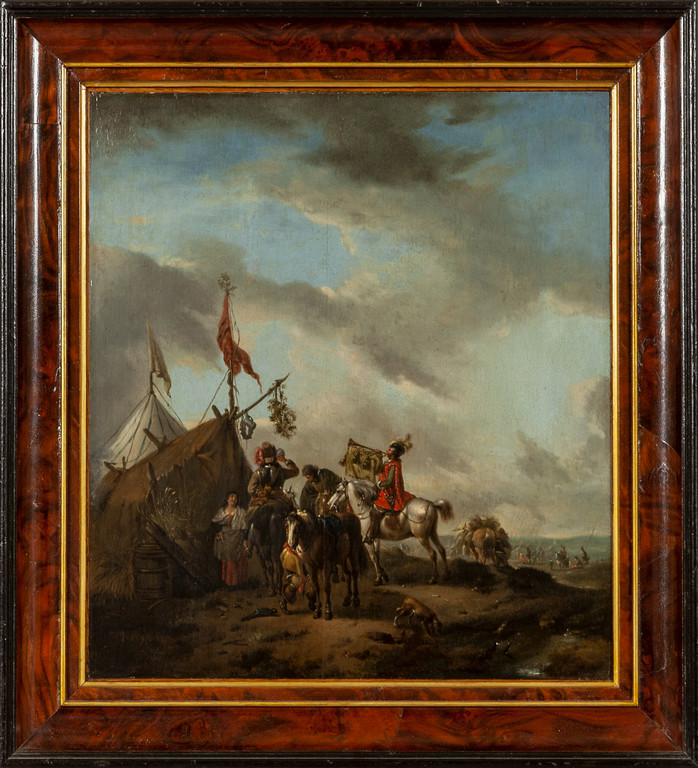 'Uomini a cavallo davanti ad una tenda' olio su tavola s.to PW in b. a ds.